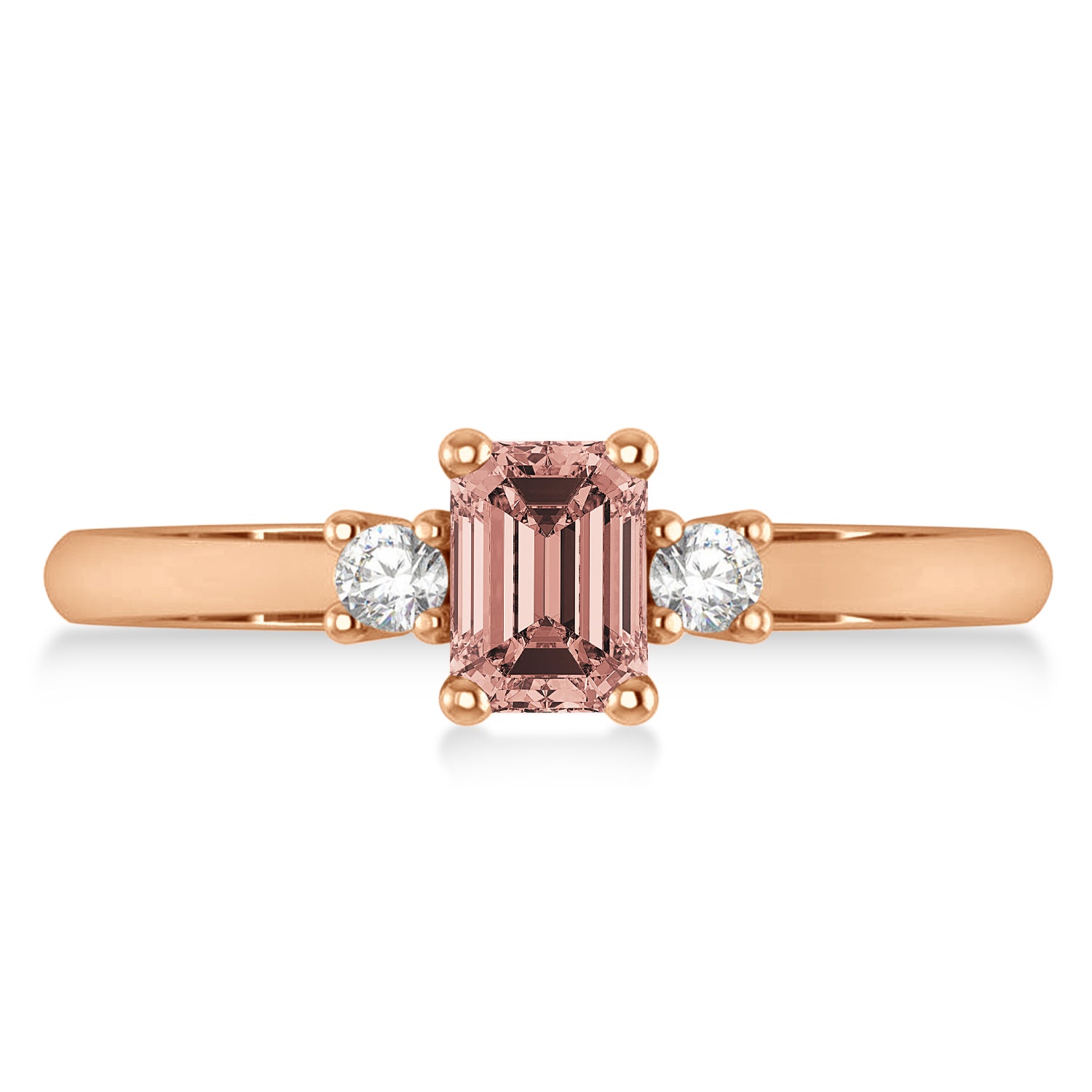 This eye-catching tri-stone Morganite ring features 0.1ct total weight of diamonds on the thin 14k Rose Gold band surrounding a beautiful 1ct Emerald cut Morganite.