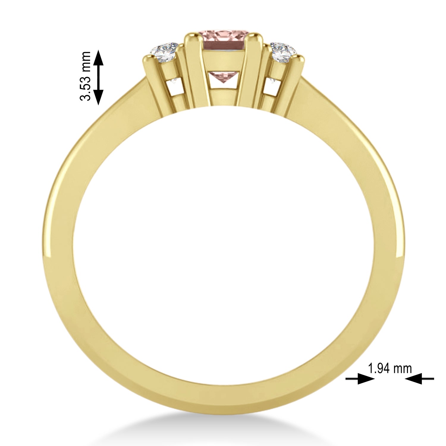 This eye-catching tri-stone Morganite ring features 0.1ct total weight of diamonds on the thin 14k Yellow Gold band surrounding a beautiful 1ct Emerald cut Morganite.