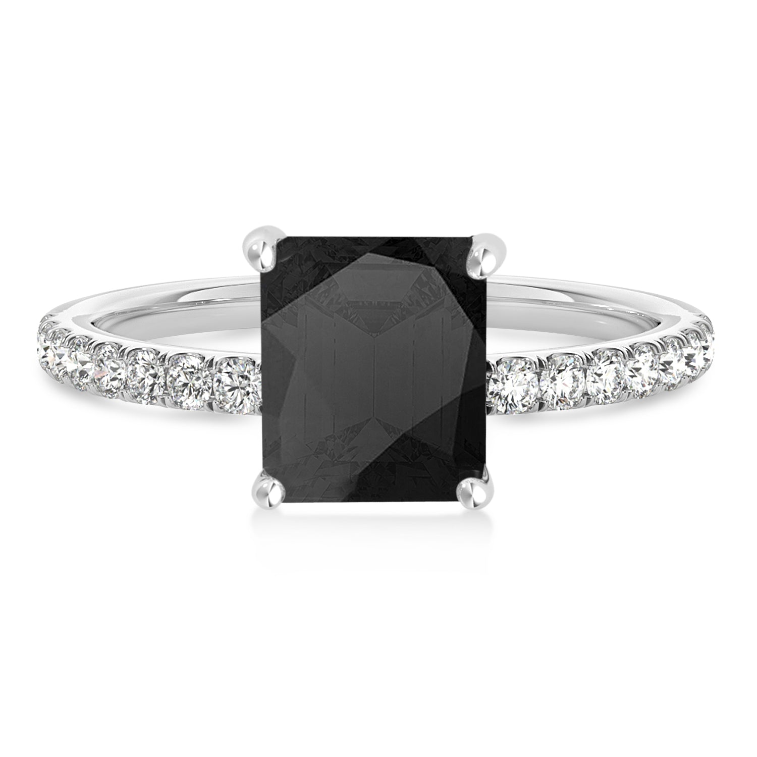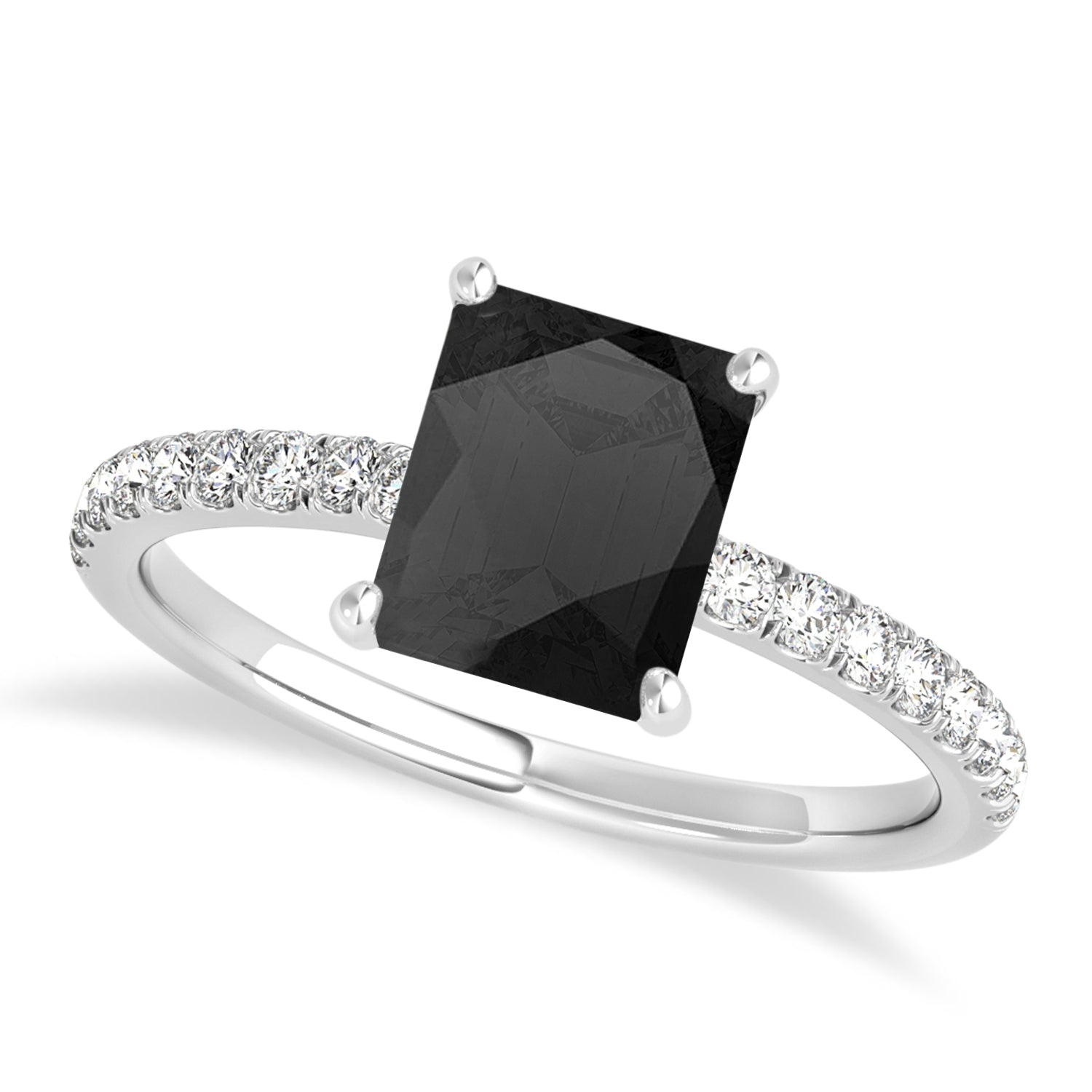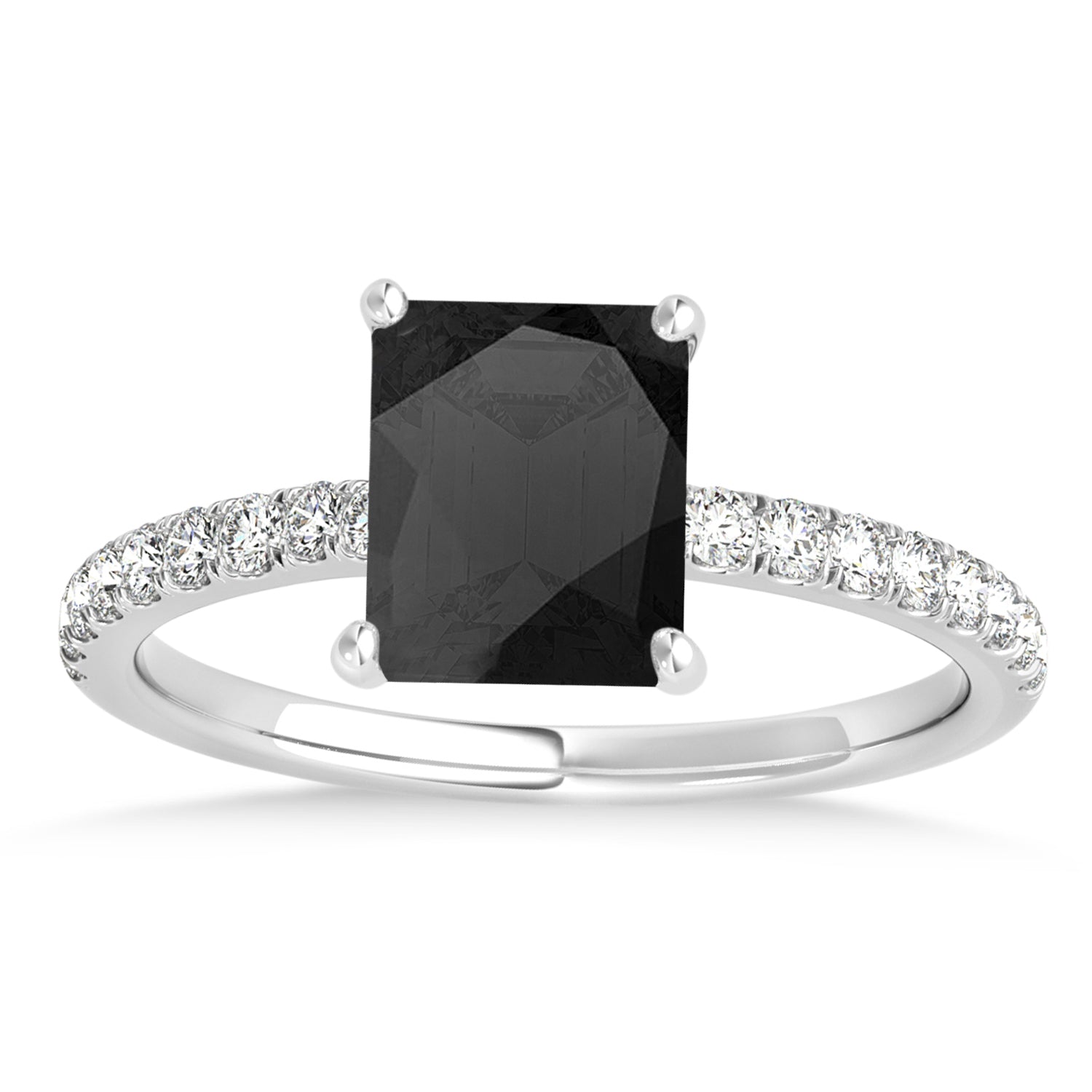 A 1.06 carat emerald-shaped Onyx is prong set into 14k White Gold in this preset hidden halo engagement ring. An abundance of prong diamond accents are featured in this ring that shine endlessly.