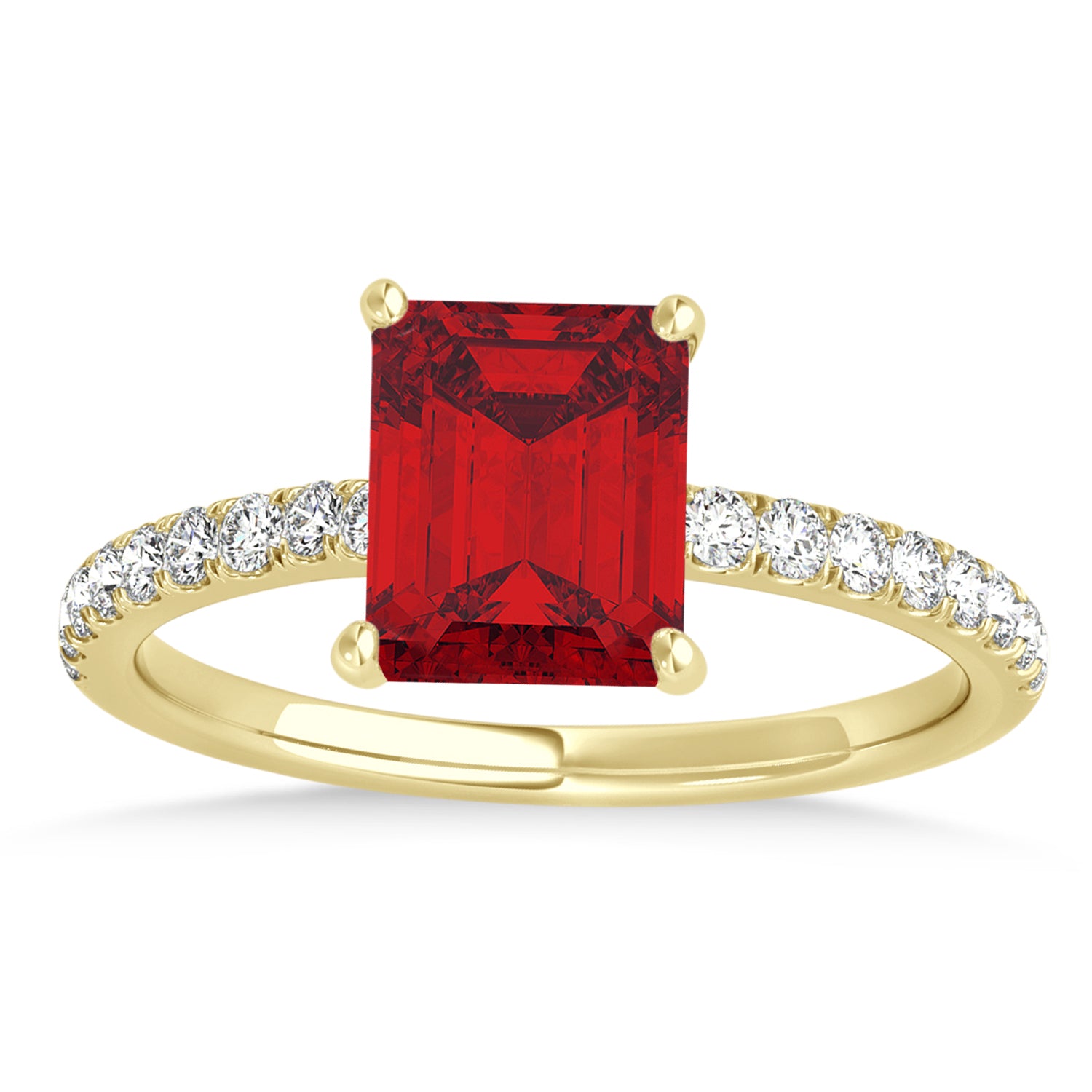 A 1.06 carat emerald-shaped Ruby is prong set into 14k Yellow Gold in this preset hidden halo engagement ring. An abundance of prong diamond accents are featured in this ring that shine endlessly.