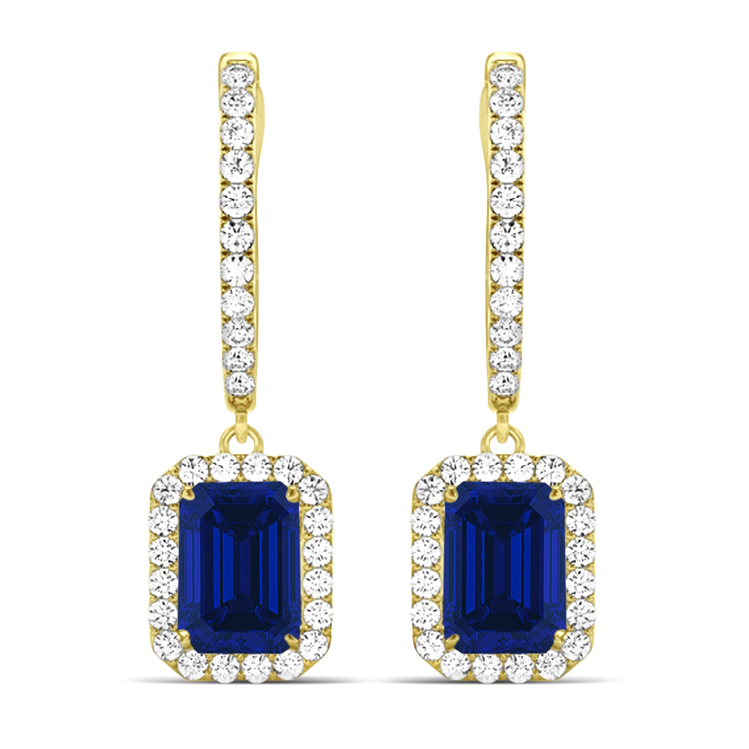 The brilliance of emerald-shaped blue sapphire is enhanced by sparkling halos of round accent stones in these gorgeous blue sapphire and diamond halo dangling earrings. Designed in 14k yellow gold, the earrings are secured by comfortable hinged hoop backings.