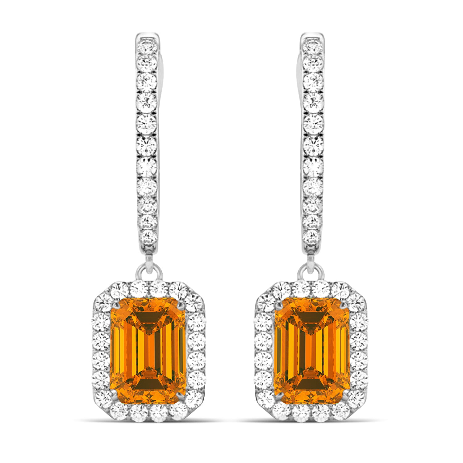 Emerald Shape Citrine & Diamond Halo Dangling Earrings 14k White Gold (1.60ct)