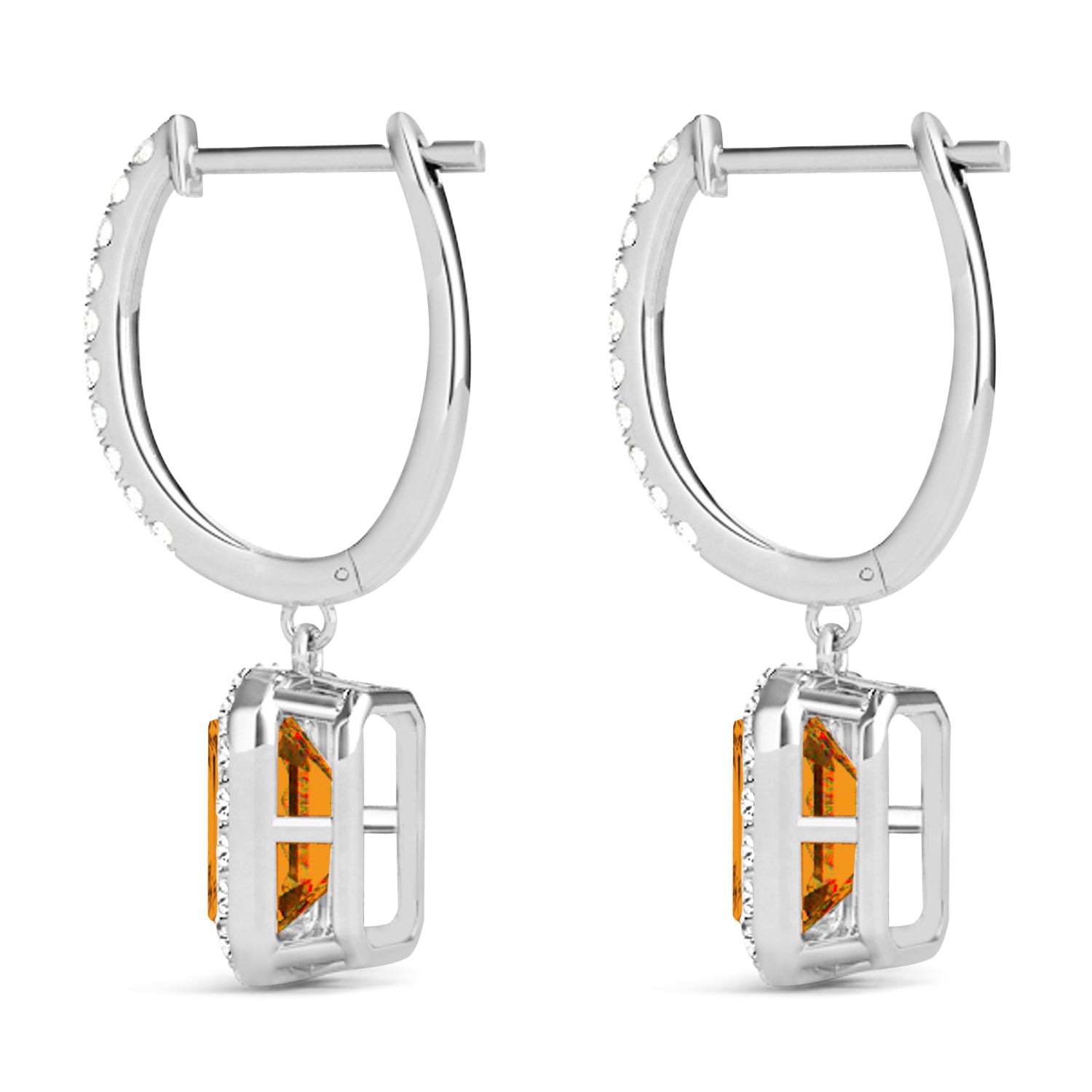 The brilliance of emerald-shaped citrine is enhanced by sparkling halos of round accent stones in these gorgeous orange citrine and diamond halo dangling earrings. Designed in 14k white gold, the earrings are secured by comfortable hinged hoop backings.