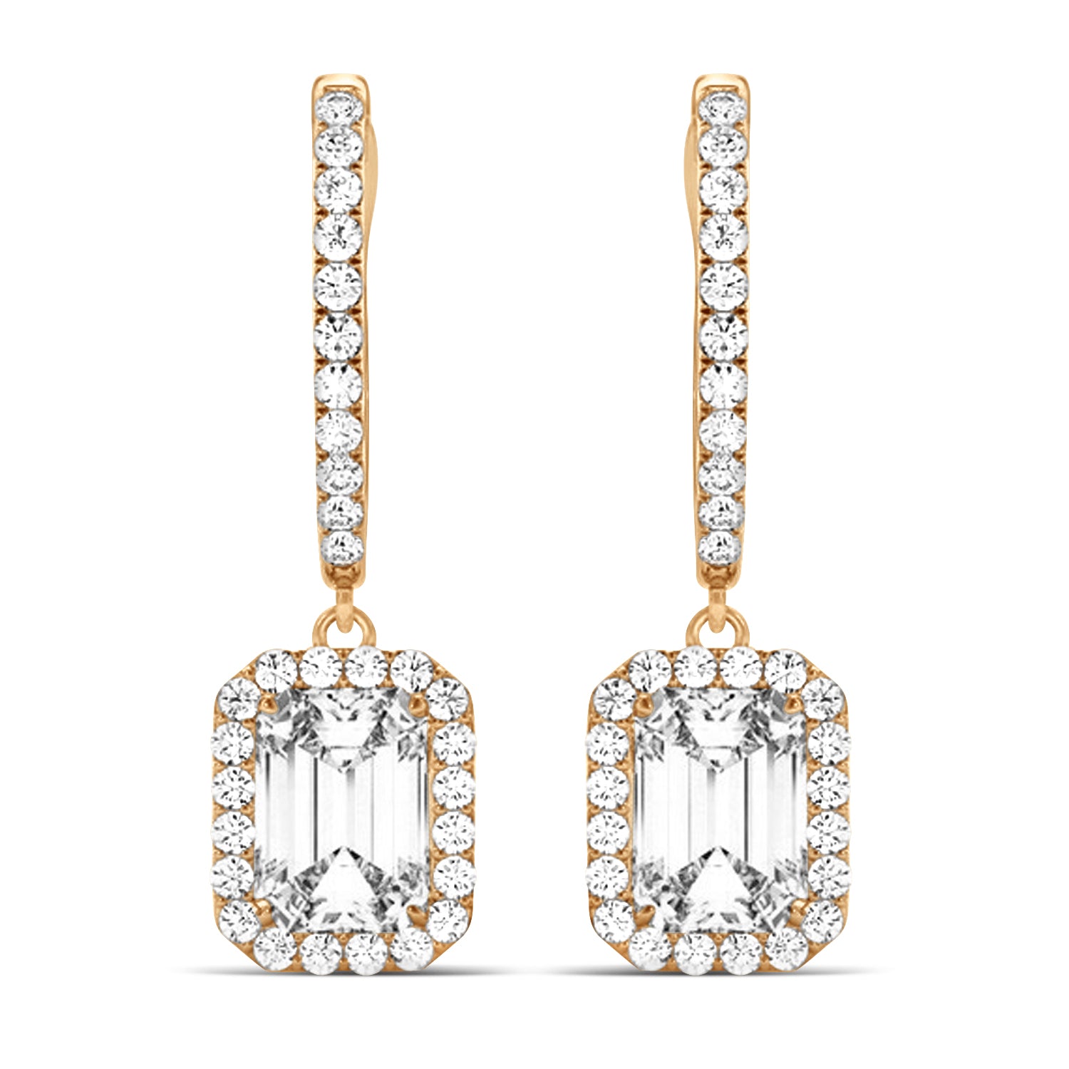 The Emerald Shape Diamond Halo Dangling Earrings come in other metals and are also available set with other precious and semi-precious emerald-shaped stones.