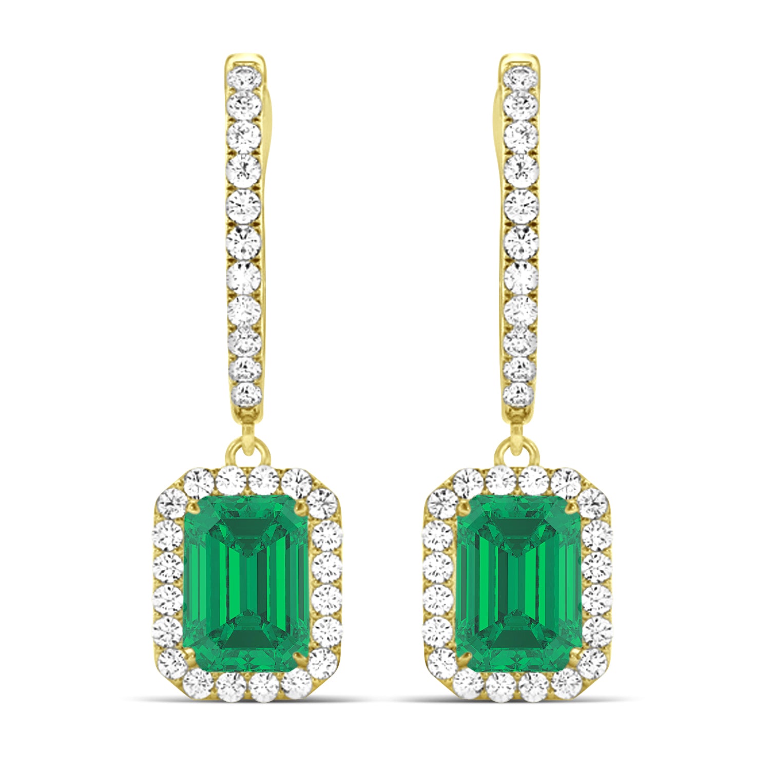 Emerald Shape Lab Emerald & Diamond Halo Dangling Earrings 14k Yellow Gold (1.70ct)