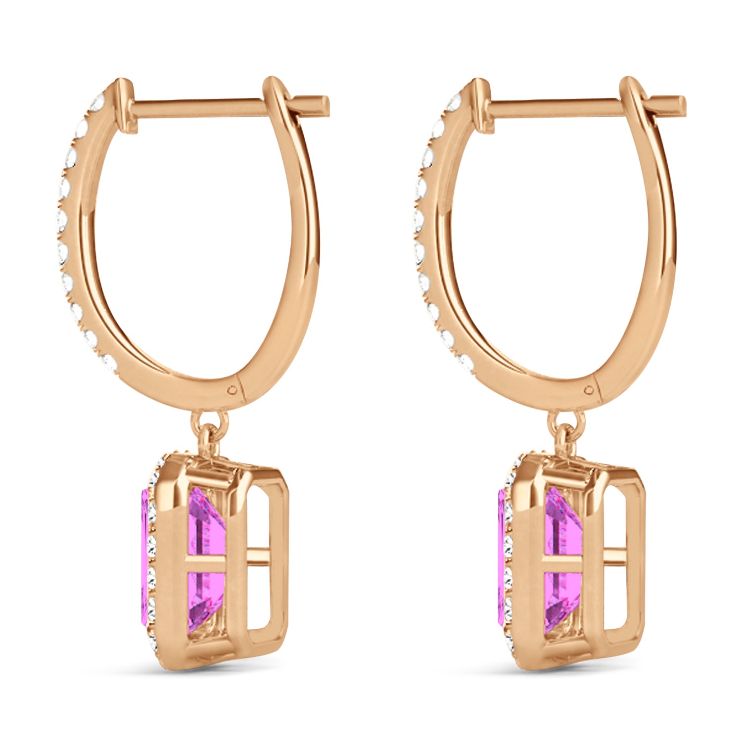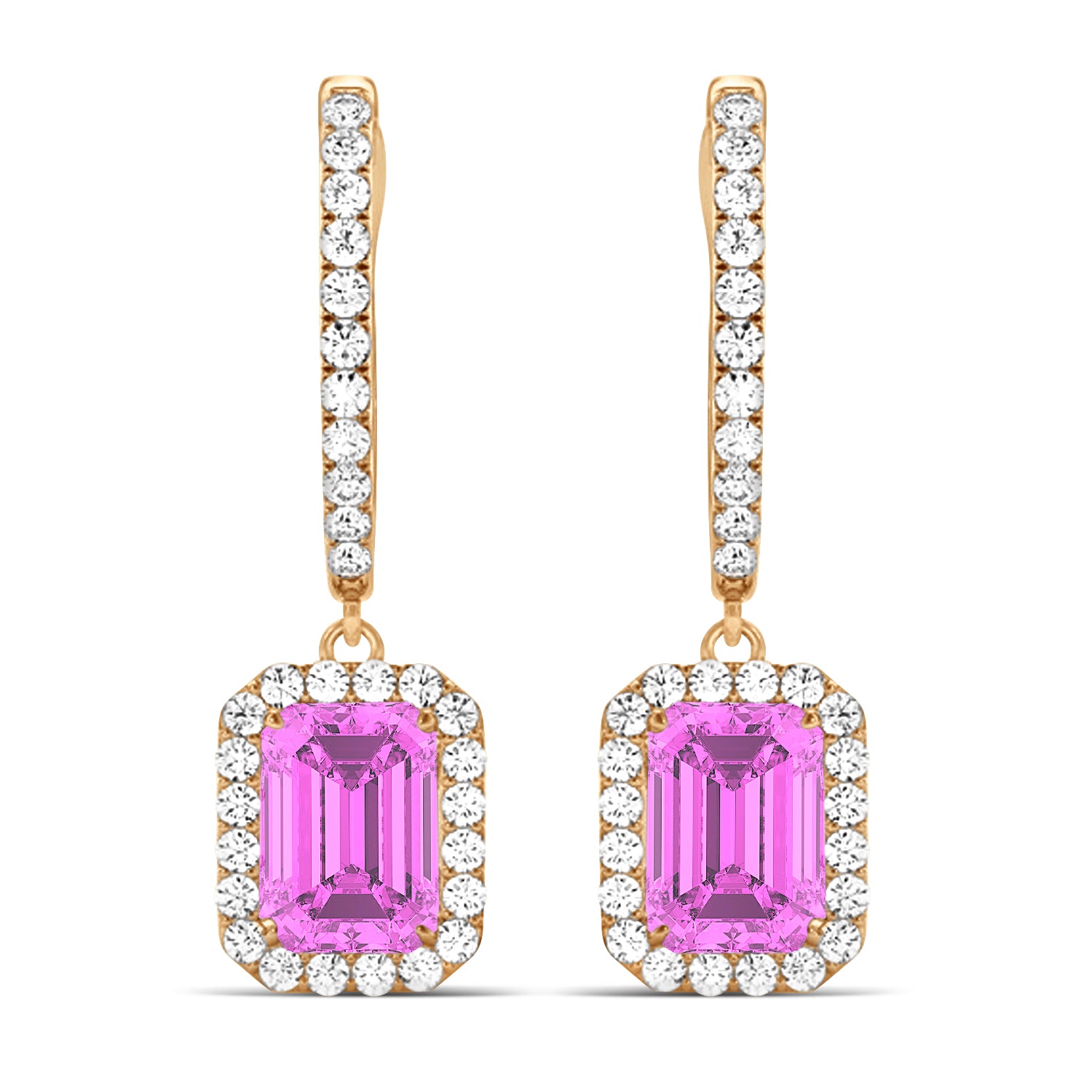 The Emerald Shape F-G Sapphire & Diamond Halo Dangling Earrings come in other metals and are also available set with other precious and semi-precious emerald-shaped stones.
