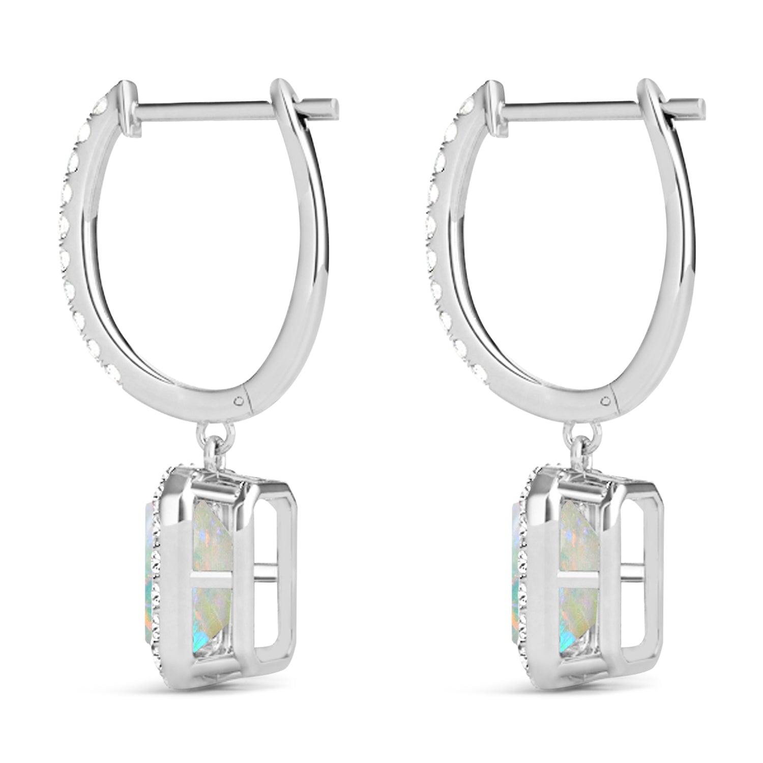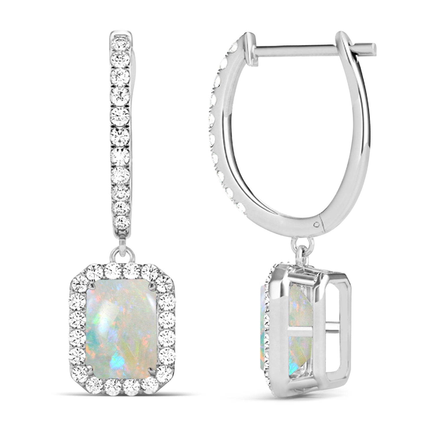 The iridescence of emerald-shaped opals is enhanced by sparkling halos of round accent stones in these gorgeous opal and diamond halo dangling earrings. Designed in 14k white gold, the earrings are secured by comfortable hinged hoop backings.
