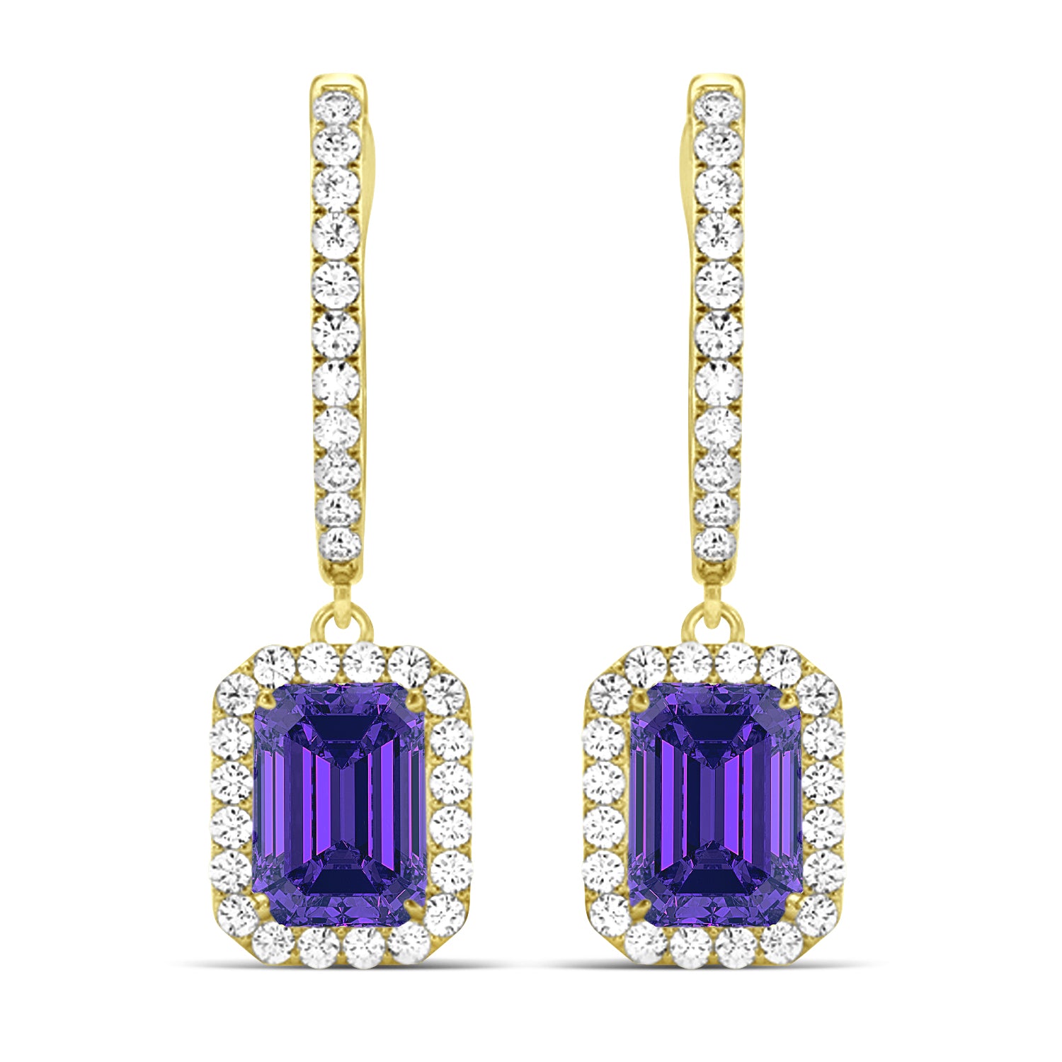 The Emerald Shape Tanzanite & Diamond Halo Dangling Earrings come in other metals and are also available set with other precious and semi-precious emerald-shaped stones.