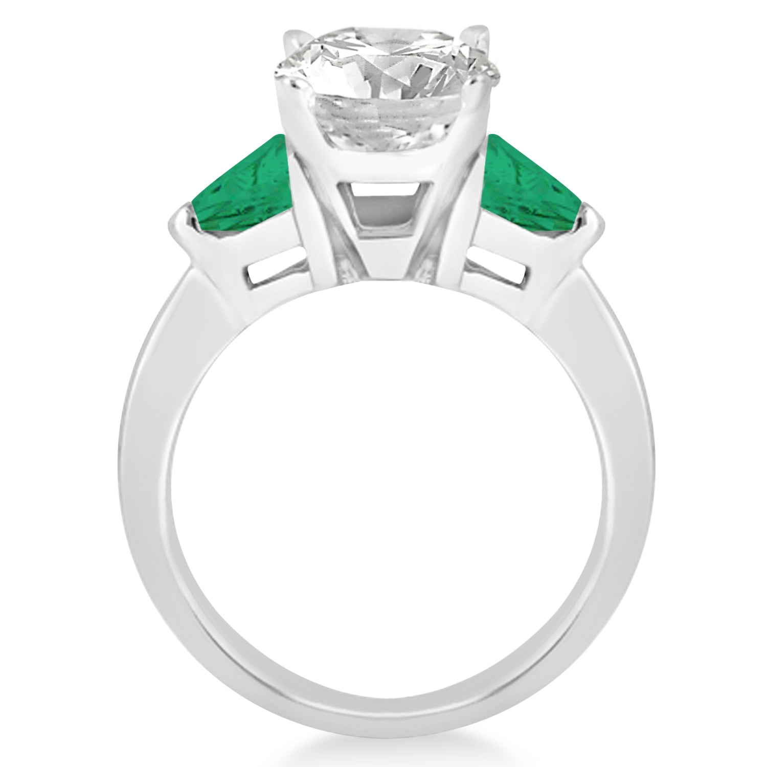 This engagement ring features two magnificent trillion cut green emerald stones, prong set, eye-clean, weighing a total of 0.70 carats. Personalize your trillion-engagement ring by choosing the cut and shape of your center stone.