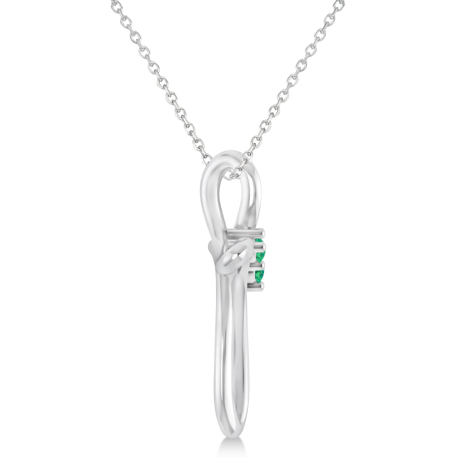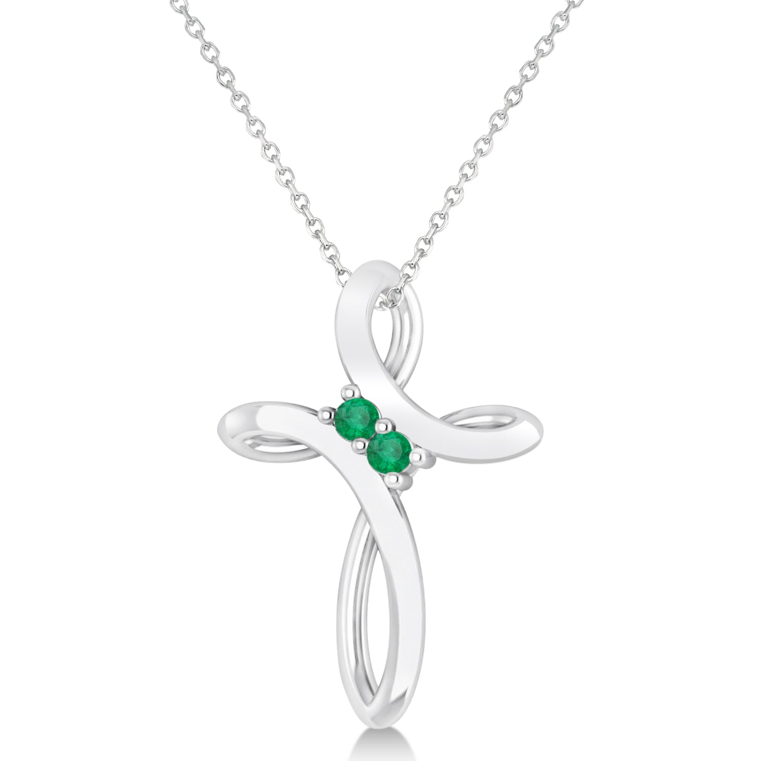Recognized as a Christian symbol of sacrifice and salvation, the cross has many other meanings in Western culture. Some consider the cross to represent all four physical elements (fire, water, air and earth) as well as the four cardinal directions (north, south, east or west). Our distinctive swirl cross pendant necklace is crafted of 14k white gold and set with a pair of green emeralds.