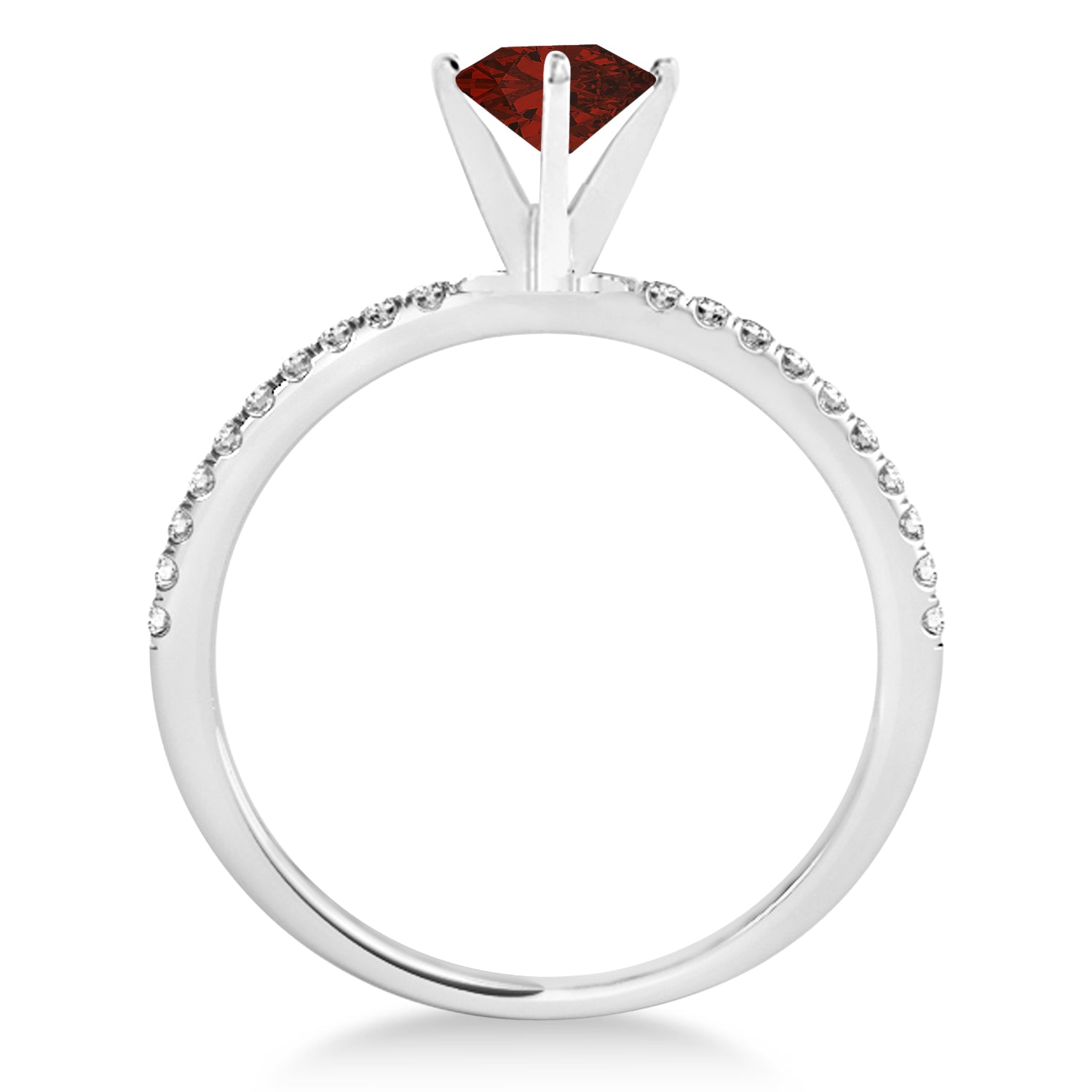 Romance personified with grace. This platinum Allurez semi-eternity band boasts a thrilling 2.88 carat oval shape center Garnet while the 20 extravagant pave-set round diamonds accenting the sides are of SI1-SI2 clarity and G-H color with an approximate carat weight of 0.12.
