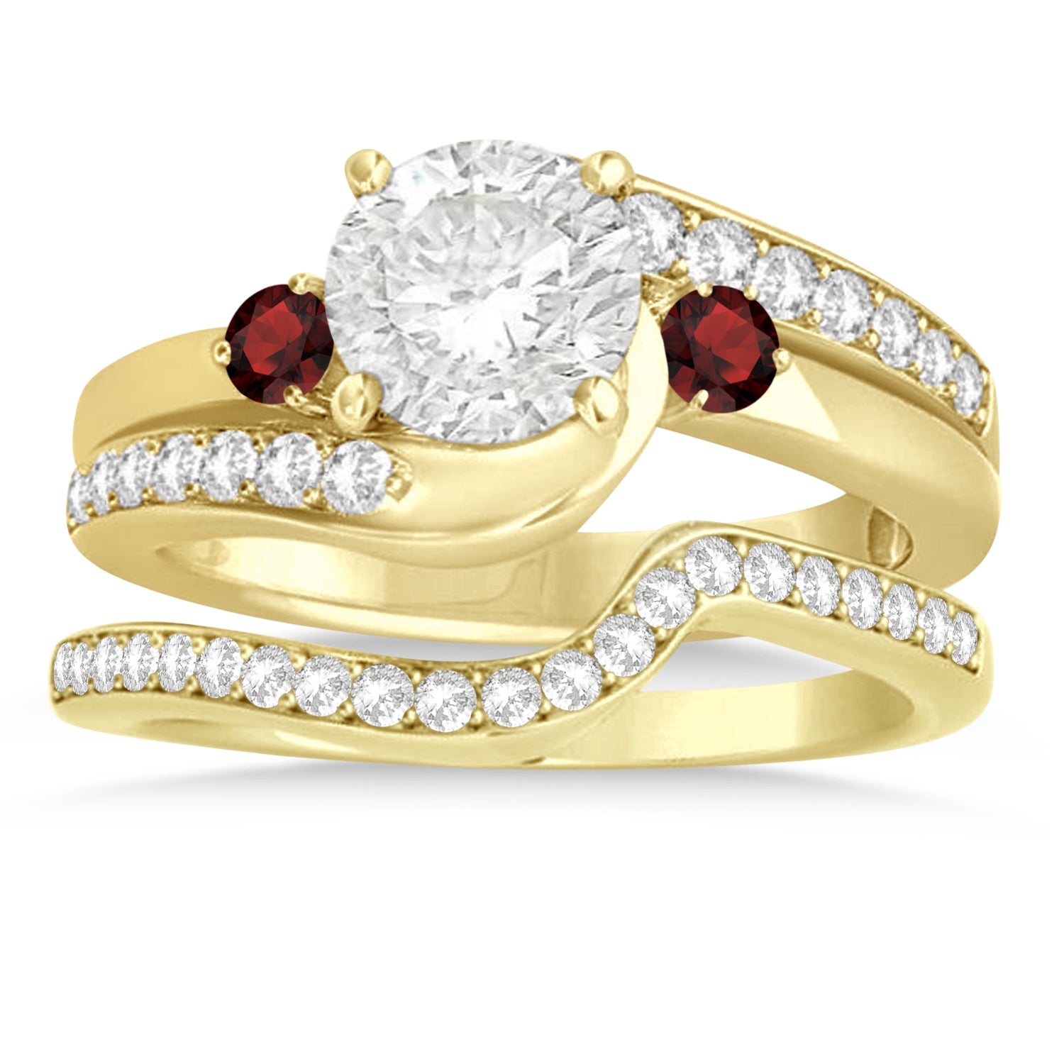 Garnet & Diamond Swirl Engagement Ring & Band Bridal Set 18k Yellow Go