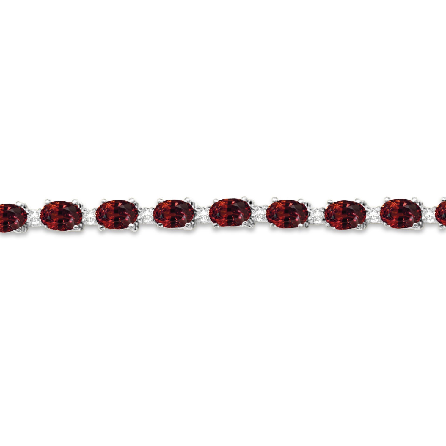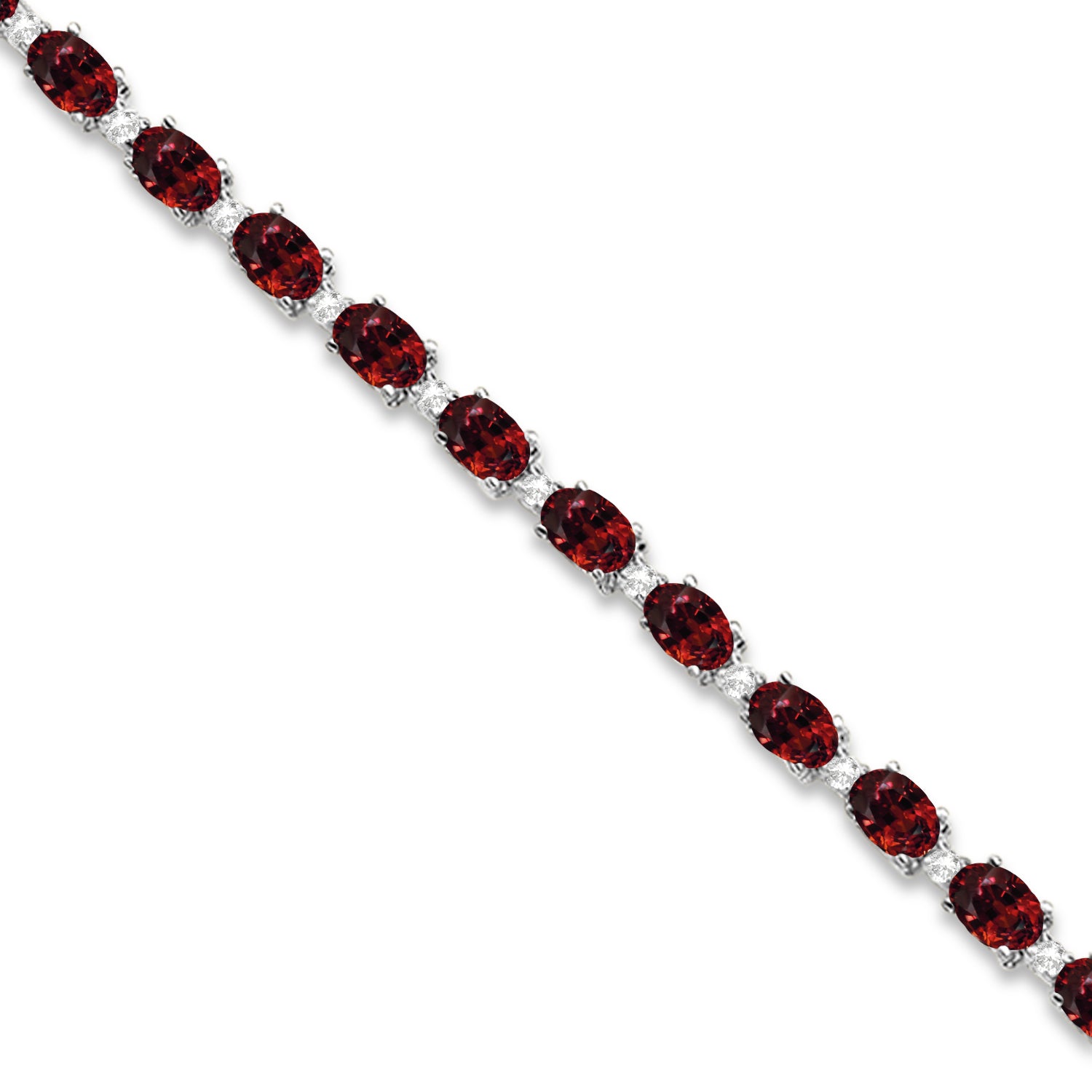 This dazzling oval garnet and diamond link tennis bracelet is carefully crafted in 14kt White Gold. This stylish garnet tennis bracelet features twenty-one oval cut 6x4mm garnets that alternate with 21 brilliant round cut diamonds.