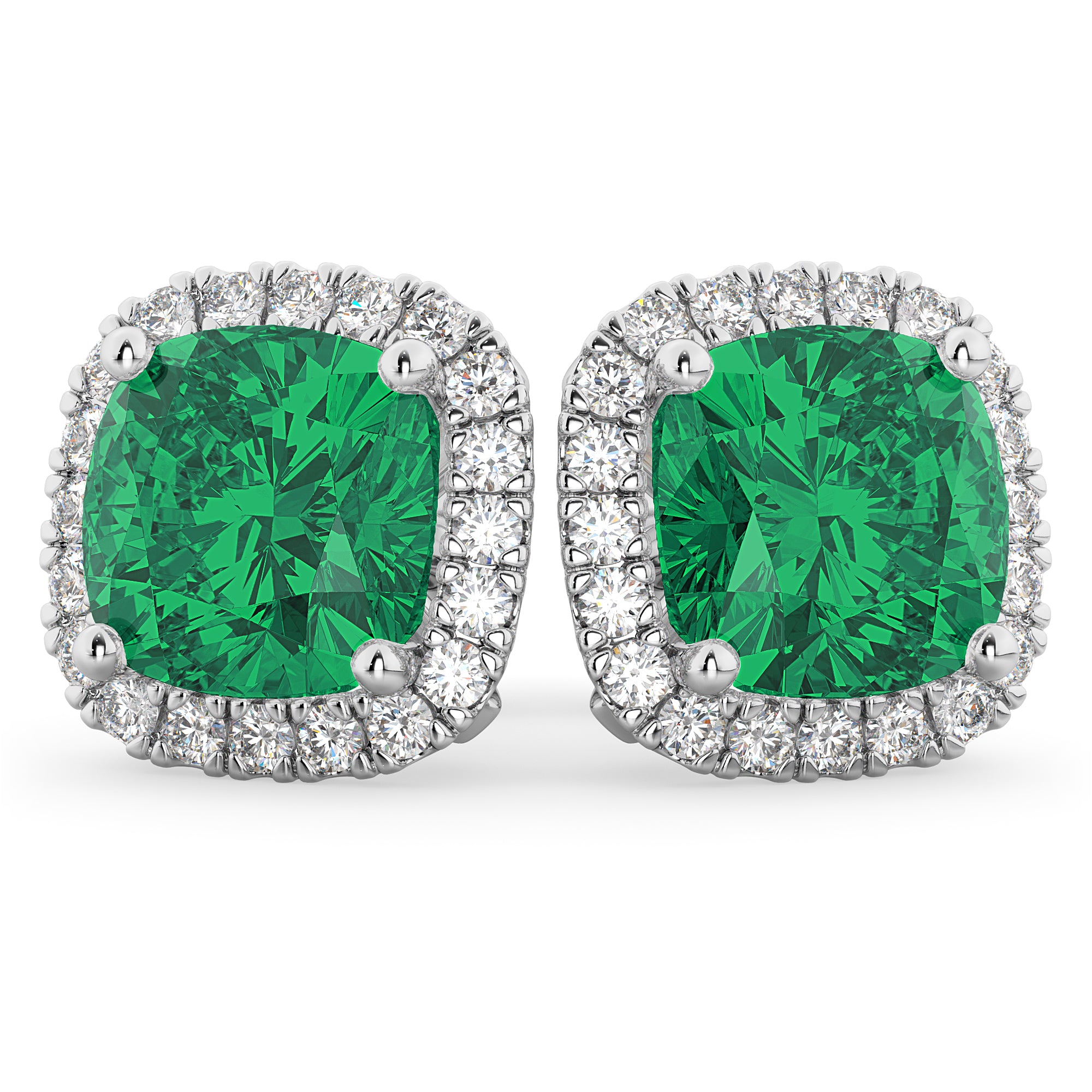 Halo Cushion Emerald & Diamond Earrings 14k White Gold (4.04ct)