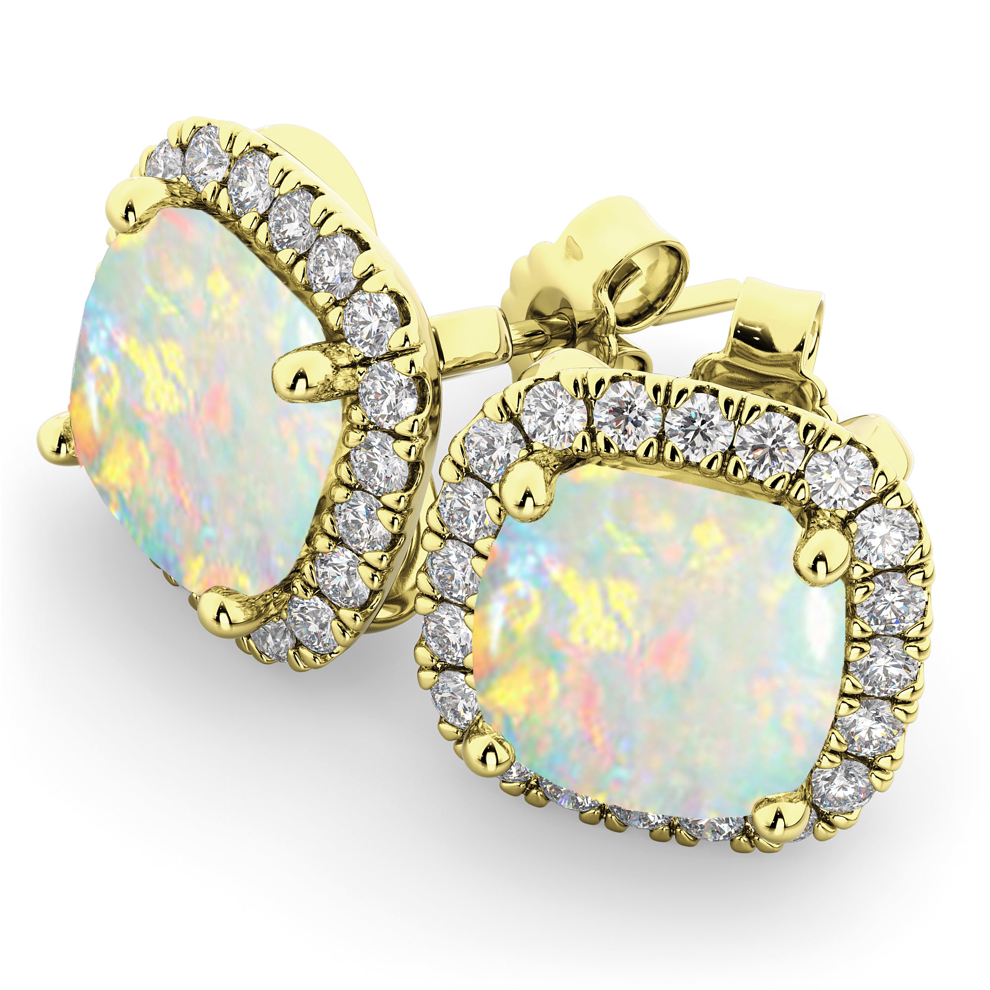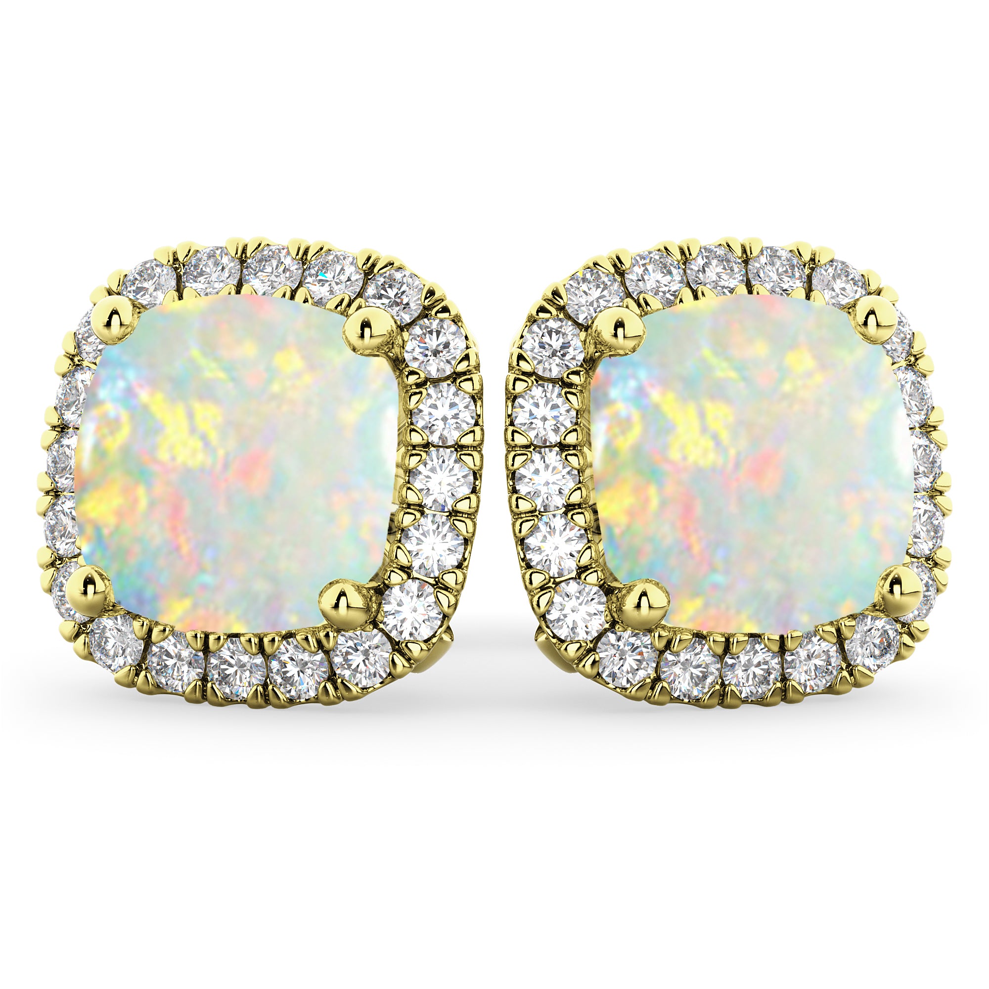 This eye-catching pair of stud earrings features 0.54ct total weight of accent diamonds surrounding two 1.75ct cushion cut Opals, all set in 14k Yellow Gold.