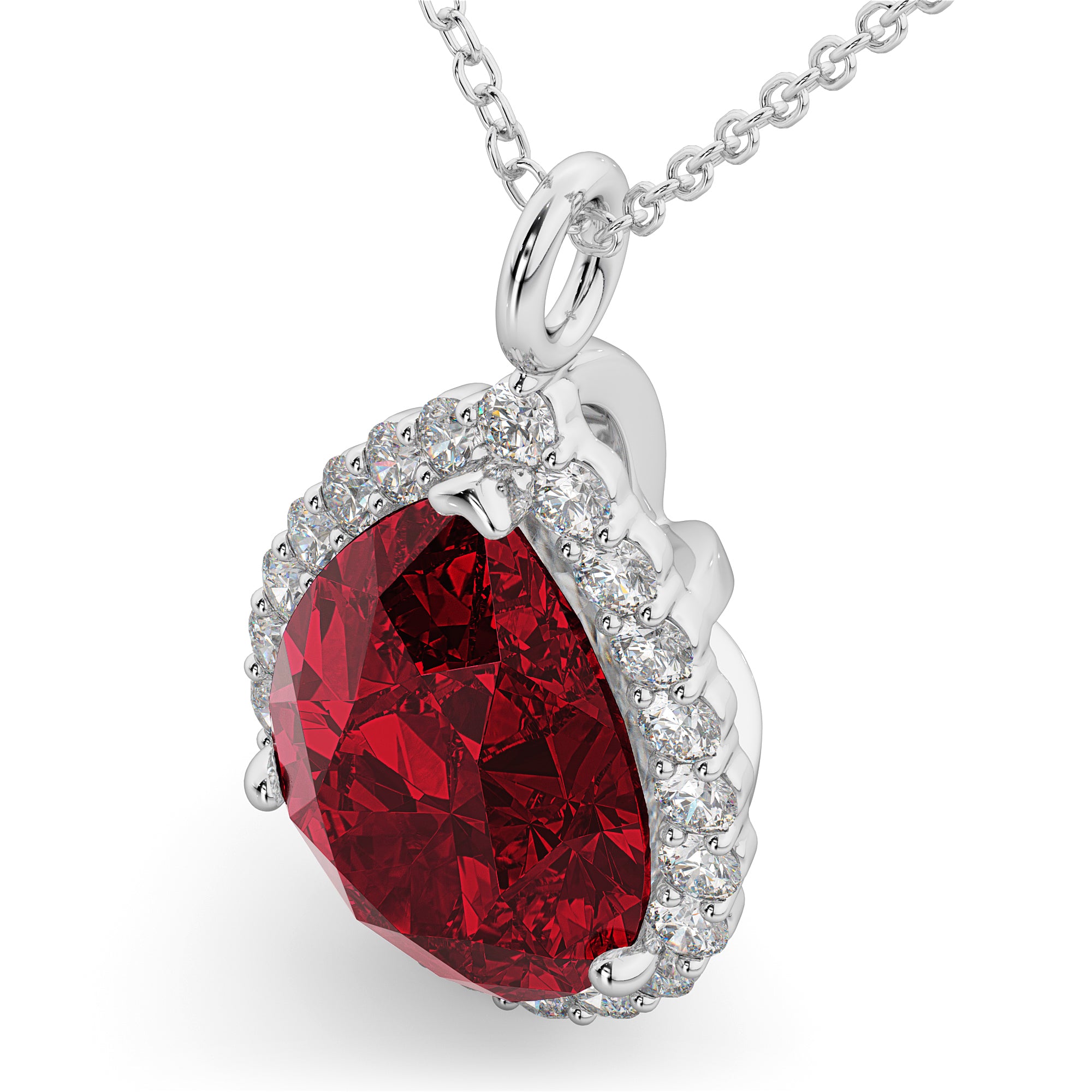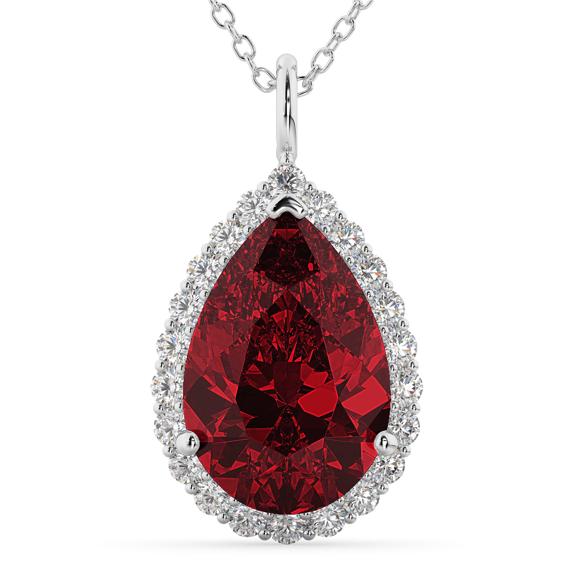 This eye-catching pendant necklace features 0.44ct total weight of lab grown diamonds surrounding a 7.90ct pear cut lab grownRuby, all set in 14k white gold.