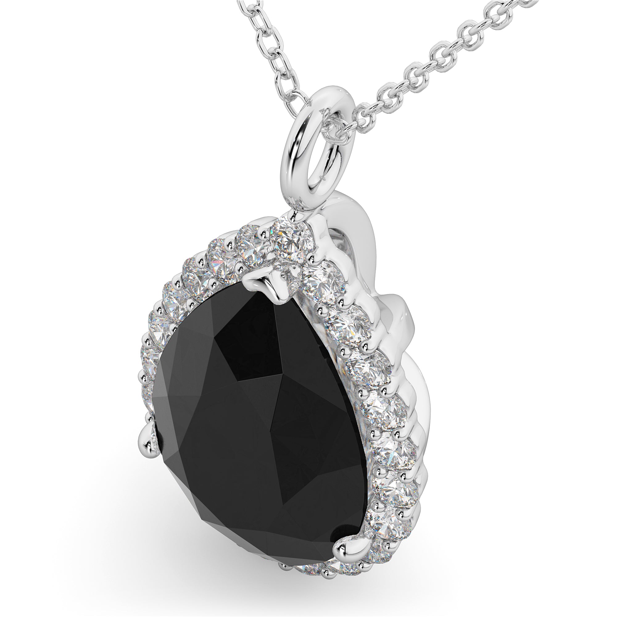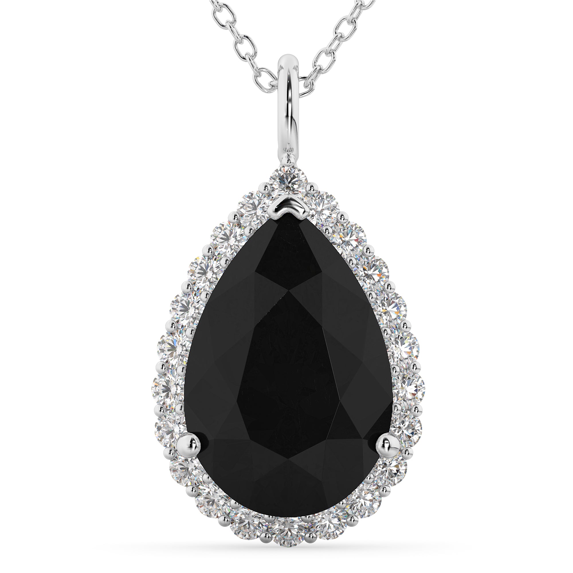 This eye-catching pendant necklace features 0.44ct total weight of accent diamonds surrounding a 4.25ct pear cut black diamond, all set in 14k white gold.