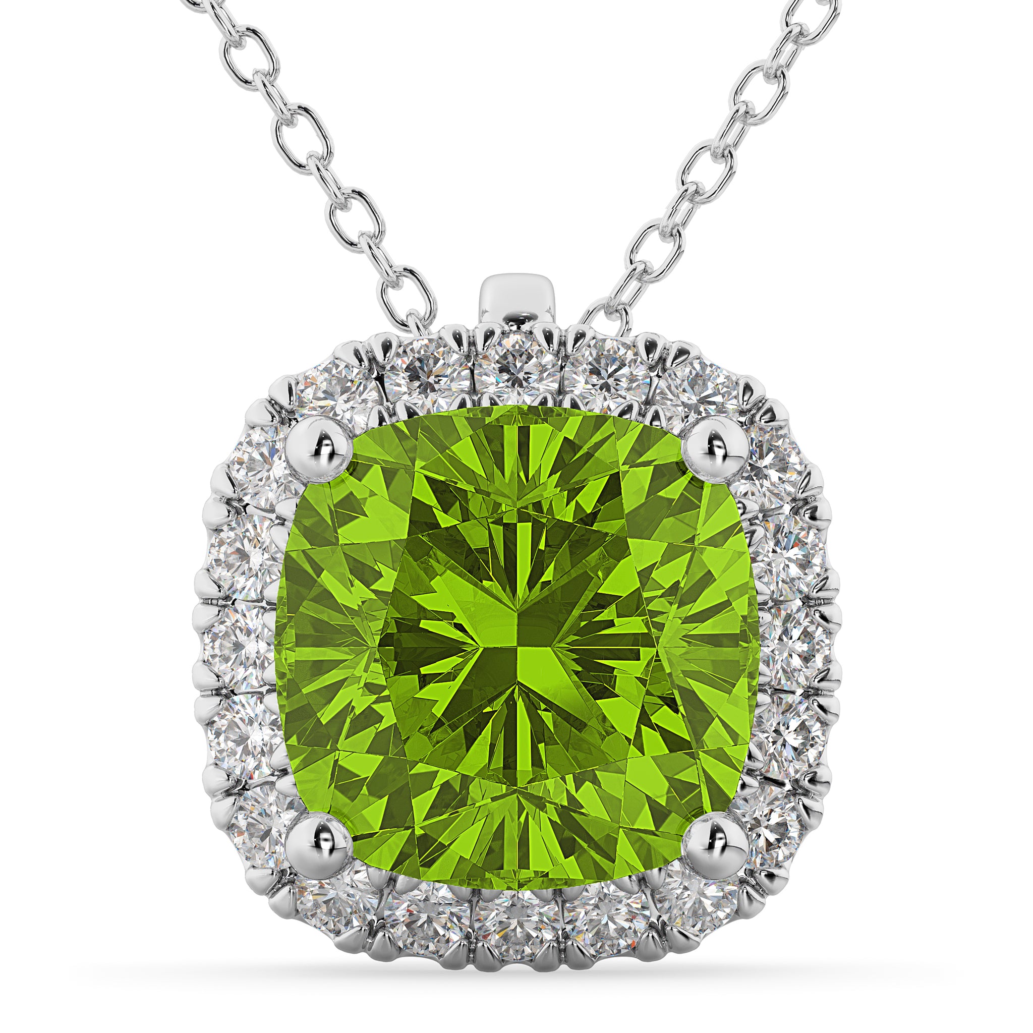 Halo Peridot Cushion Cut Pendant Necklace 14k White Gold (2.02ct)