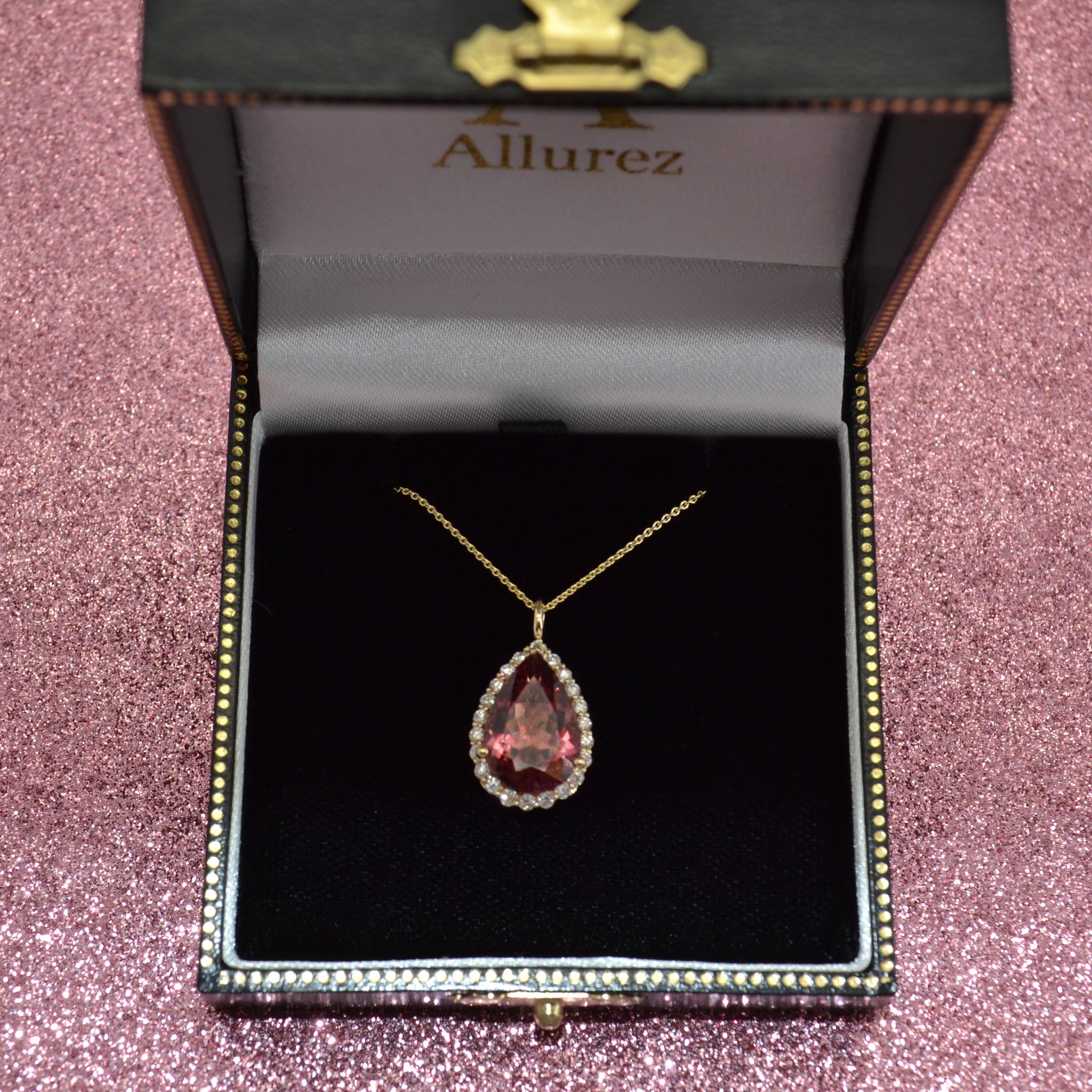 This eye-catching pendant necklace features 0.44ct total weight of accent diamonds surrounding a 6.75ct pear cut Pink Tourmaline, all set in 14k Yellow Gold.
