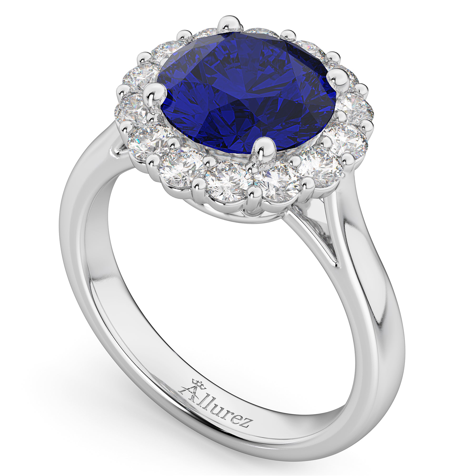 Halo Round Blue Sapphire & Diamond Engagement Ring 14K White Gold 4.45ct