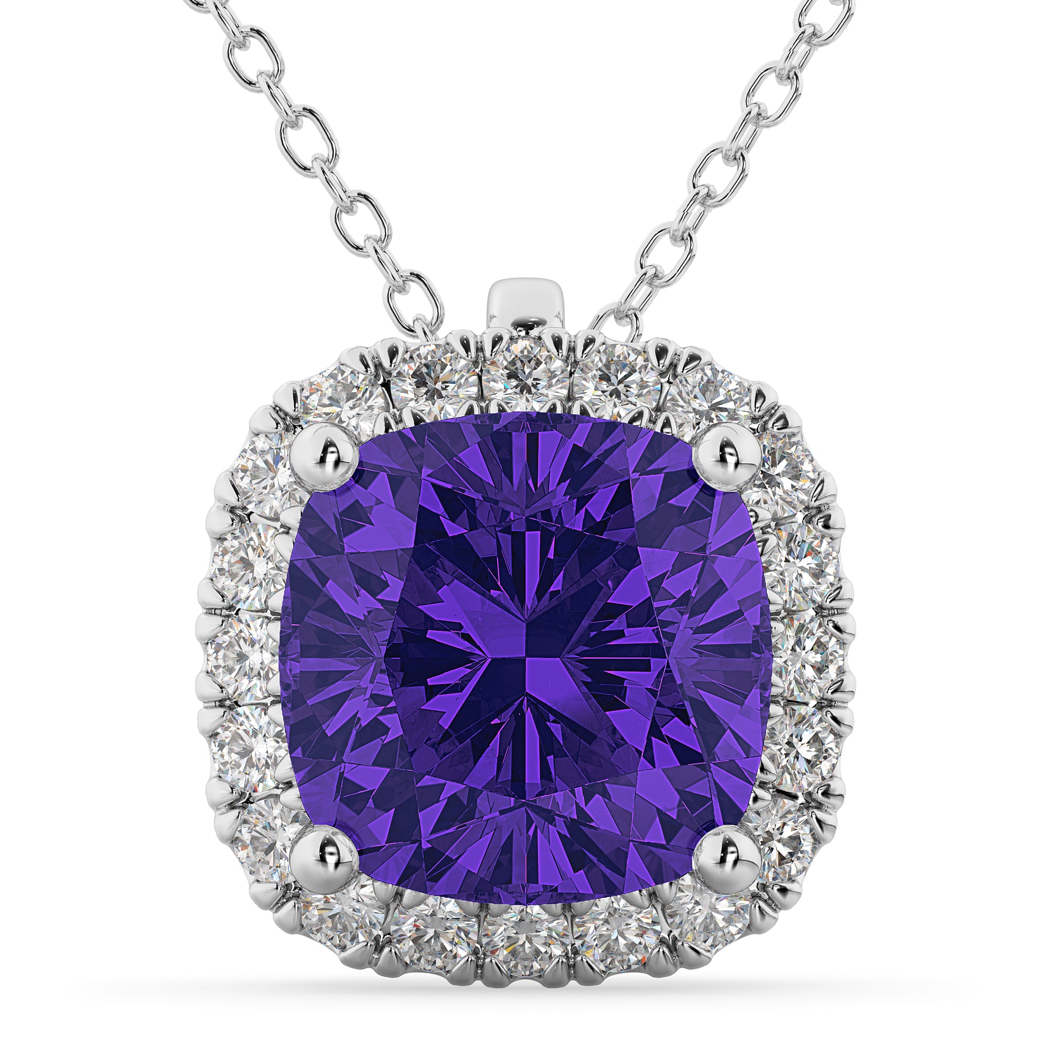 This eye-catching pendant necklace features 0.27ct total weight of accent diamonds surrounding a 1.75ct cushion cut Tanzanite, all set in 14k white gold.