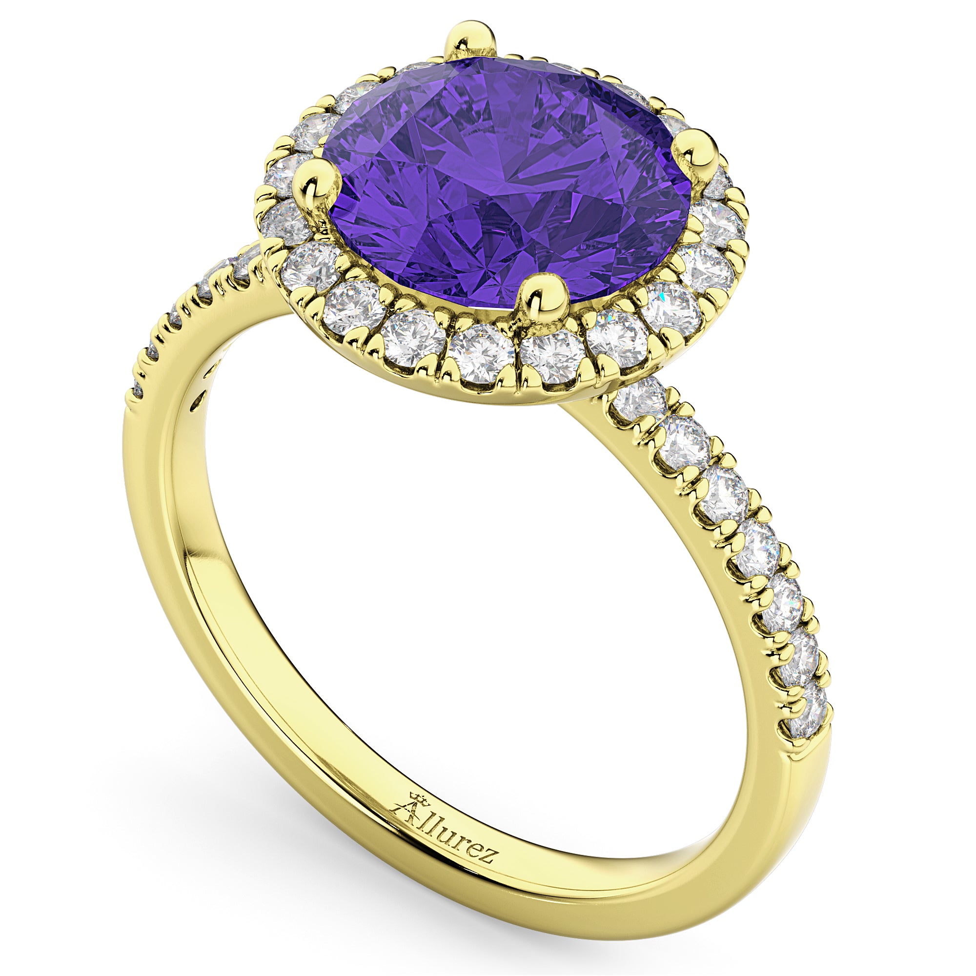 This eye-catching halo diamond ring features 0.55ct total weight of accent diamonds on the thin, 14k Yellow Gold band, as well as surrounding a 2.30ct round cut Tanzanite.