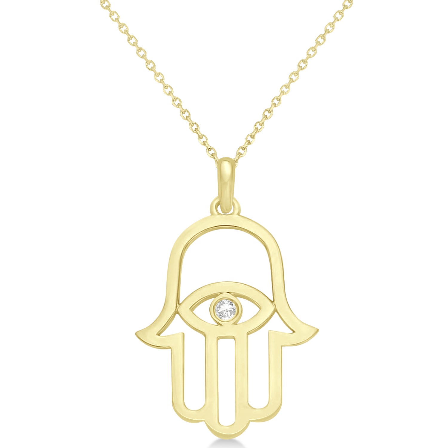 Belief in the Evil Eye and the Hamsa can be found in almost every culture throughout the world, and both symbols protect the wearer ? the religious Chamsa, from bad fortune; and the Evil Eye, from the envy of one's good fortune. Our distinctive pendant necklace combines both symbols in a design highlighted by an individual round diamond that represents the "eye" of the Evil Eye.