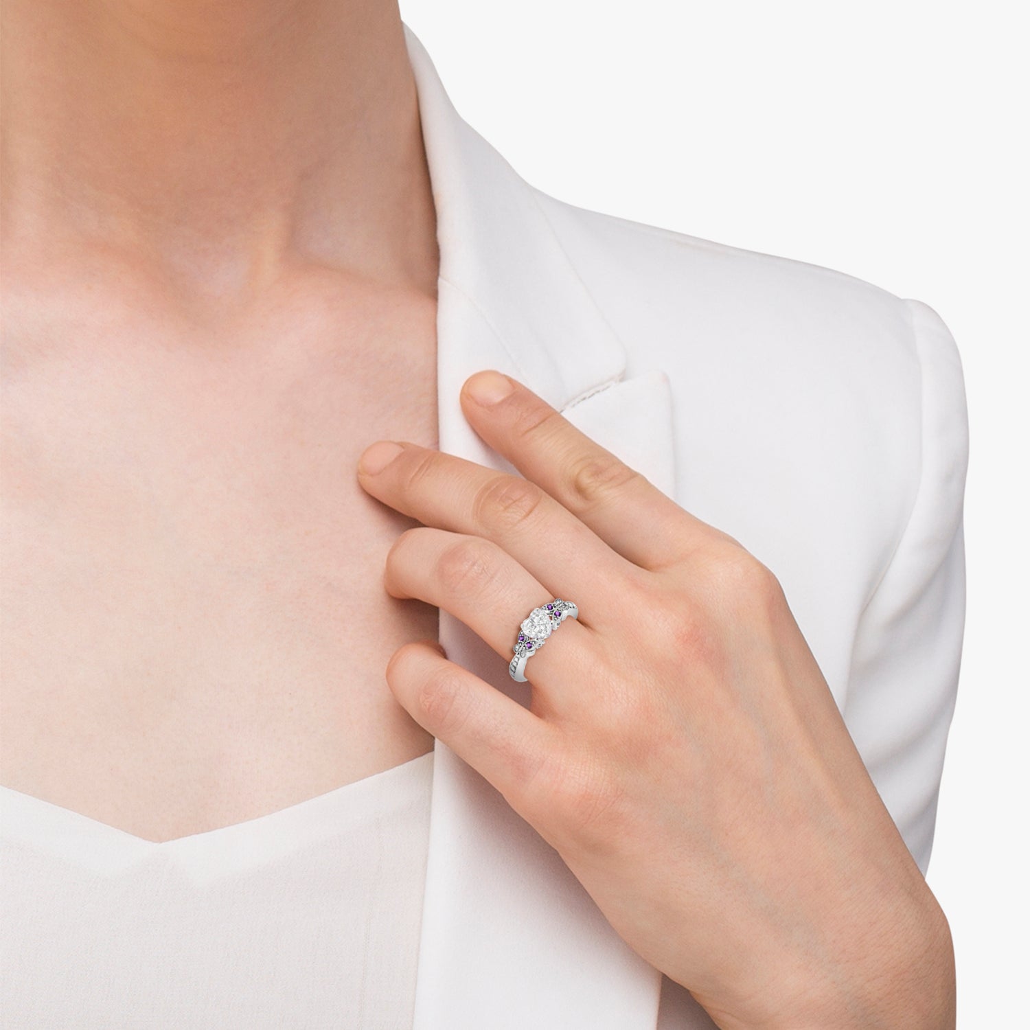 This stunning butterfly design engagement ring displays a total of 4 pave-set amethyst and 10 diamond side stones and a fantastic heart shape 0.58ct (approximate) diamond center stone in a 4-prong setting. The 14k white gold band features delicate milgrain edges.