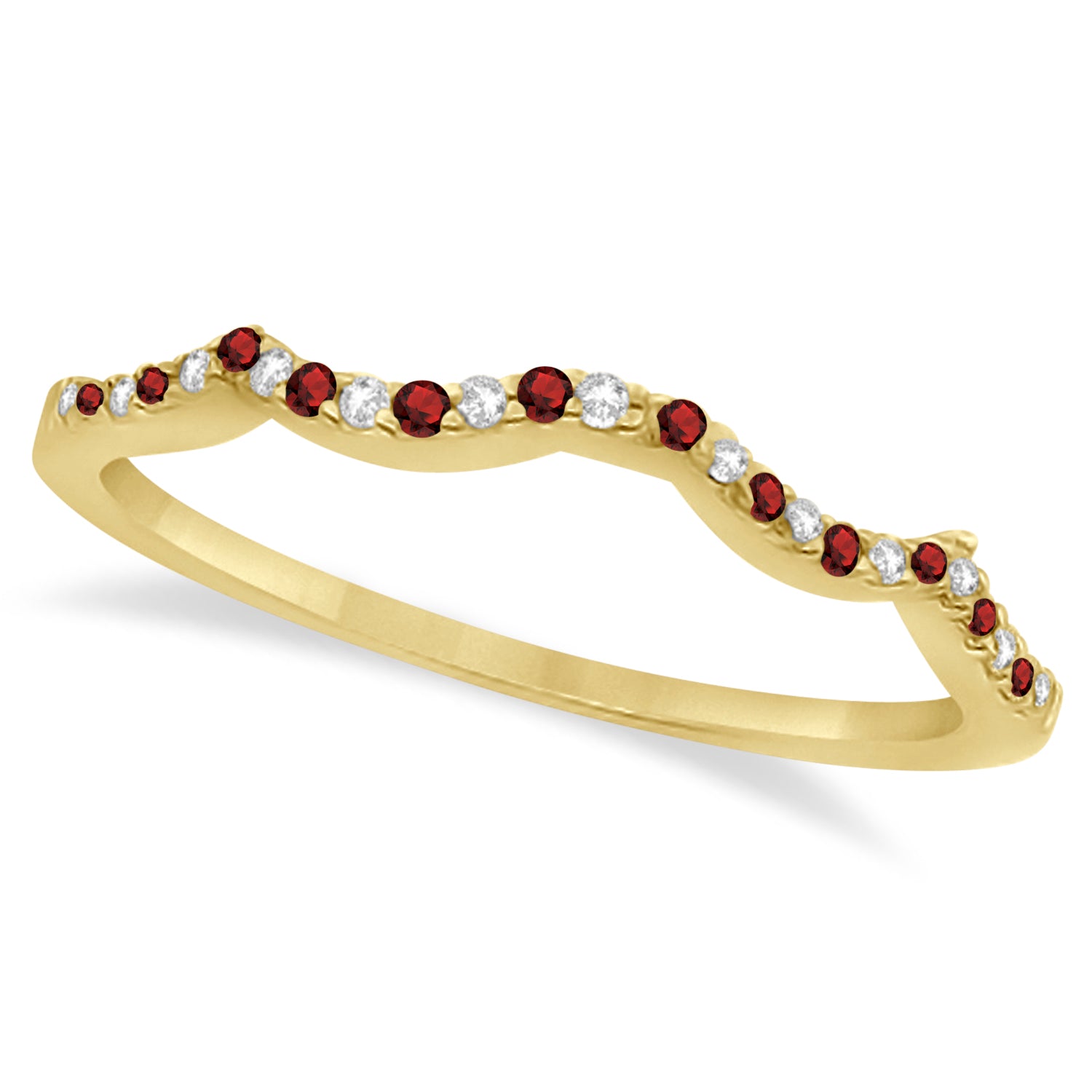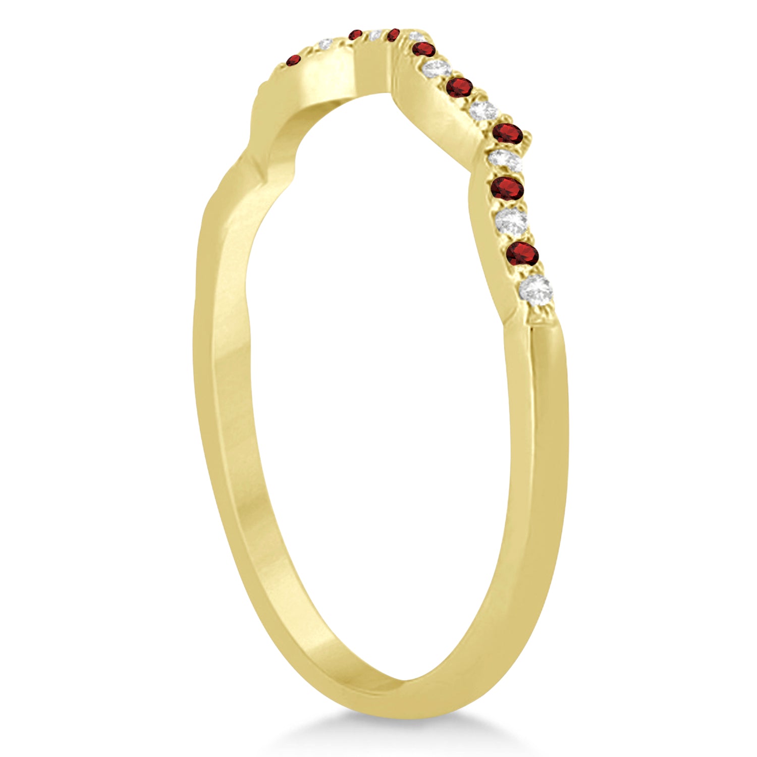 This 14k yellow gold diamond and garnet infinity style engagement ring and matching contoured wedding band were designed to work perfectly together. With a total weight of approximately 1.29 carats, this stunning preset twisted garnet and diamond bridal set is a shining symbol of the love you two share.