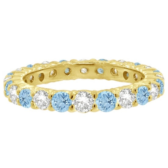 This stunning Semi-Precious gemstone eternity band features about 15 lab round blue Lab Aquamarines alternating with 14 brilliant cut Lab diamonds. The stones are beautifully circling all the way around the band and are set in an elegant 14kt yellow gold shared prong setting.