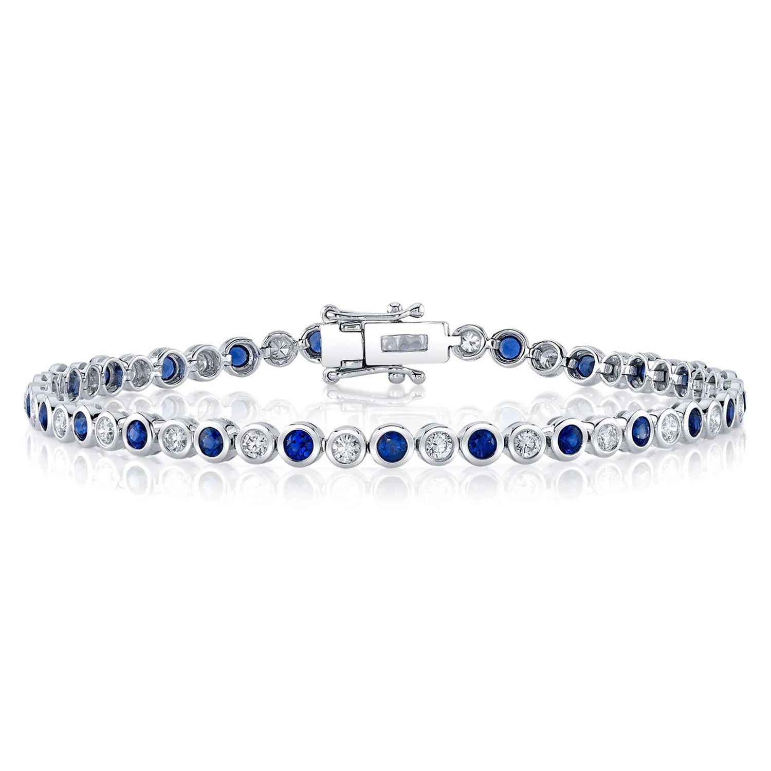 Elevate your wrist with our exquisite 1.50ct Lab Blue Sapphire & 1.0ct Lab Diamond Bezel Tennis Bracelet crafted in lustrous 14K White Gold. This captivating piece features a single row of alternating lab-created blue sapphires and brilliant lab diamonds, meticulously prong-set to maximize their brilliance. The deep blue hue of the sapphires harmonizes beautifully with the dazzling sparkle of the diamonds, creating a timeless and elegant design. Whether worn solo or stacked, this tennis bracelet adds sophistication to any ensemble. Embrace sustainable luxury with this eco-friendly bracelet that combines classic style with modern sensibility.