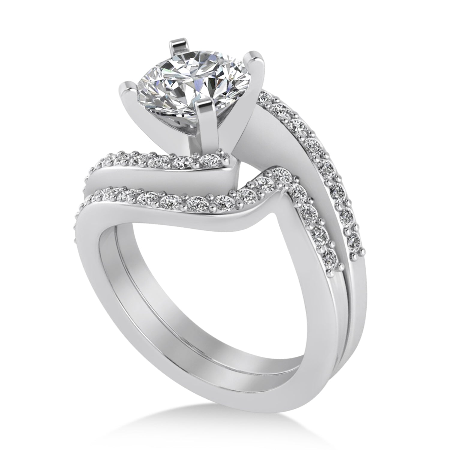This contemporary side stone accented twisted swirl engagement ring with matching band features a total...