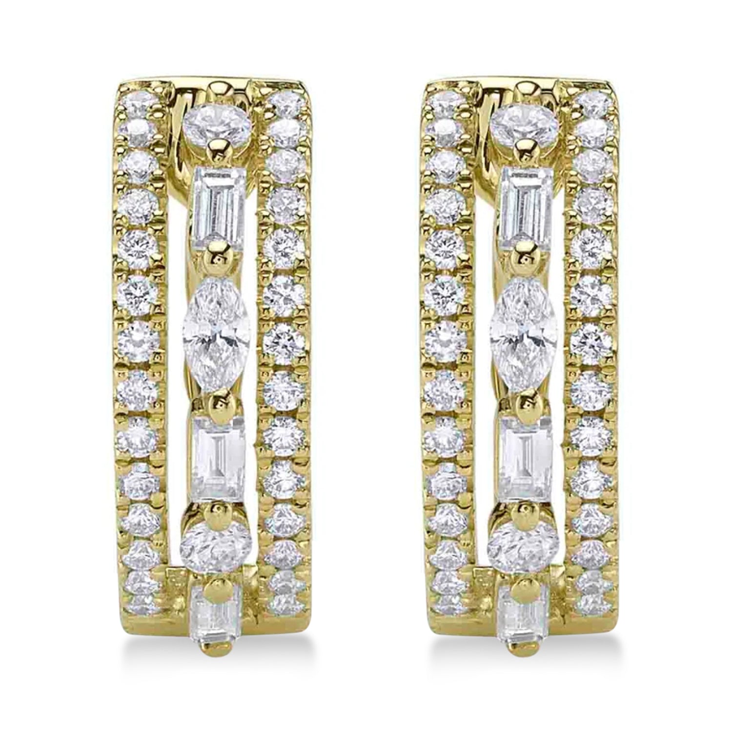 Featuring a total diamond weight of 0.59 carats, these earrings showcase a captivating mix of round, marquise, and baguette-shaped diamonds, perfectly set in a sleek 14K yellow gold frame.