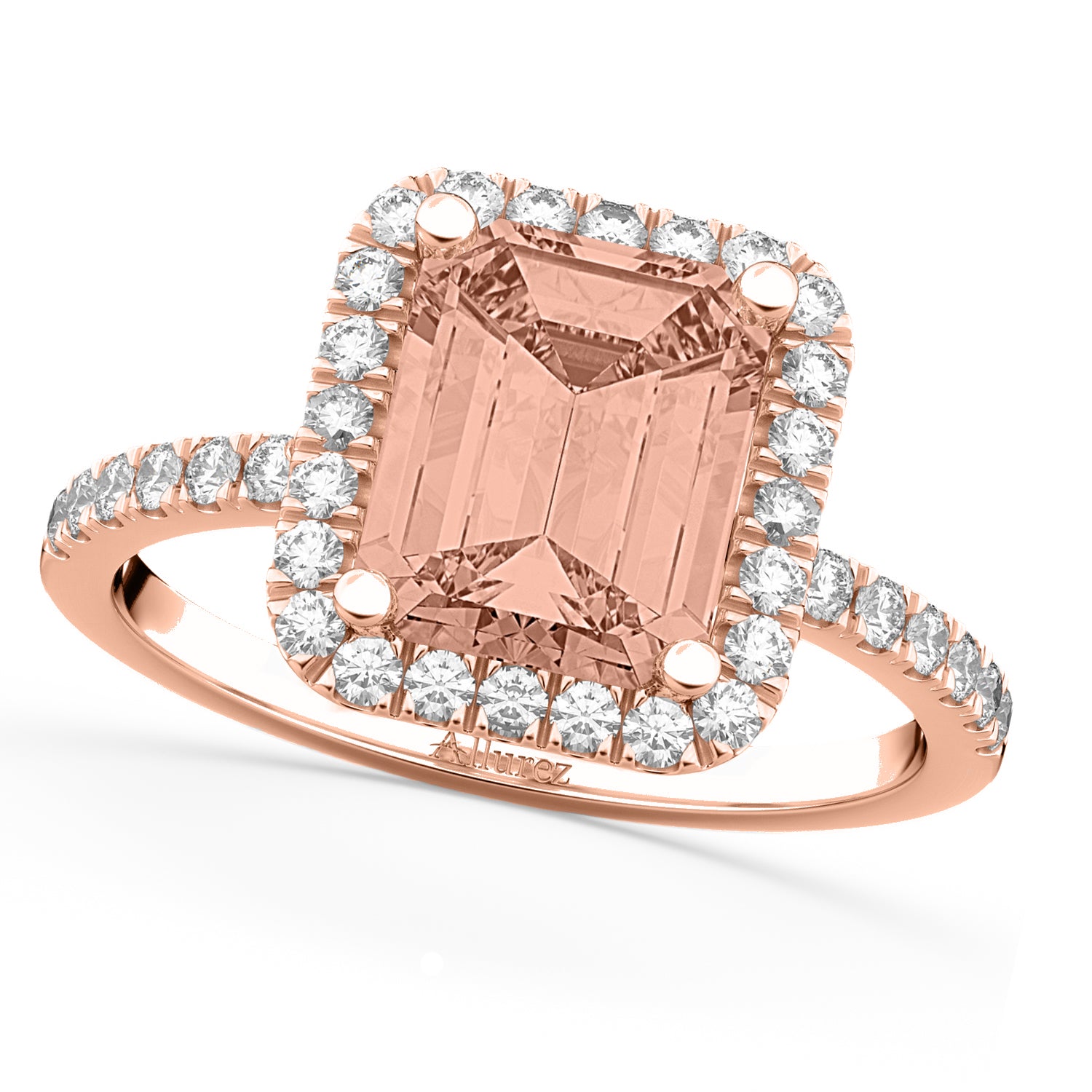 The prong set lab grown diamonds form a border around the Lab Morganite creating a rectangular halo, and also travel halfway down the ring's 18k rose gold band.