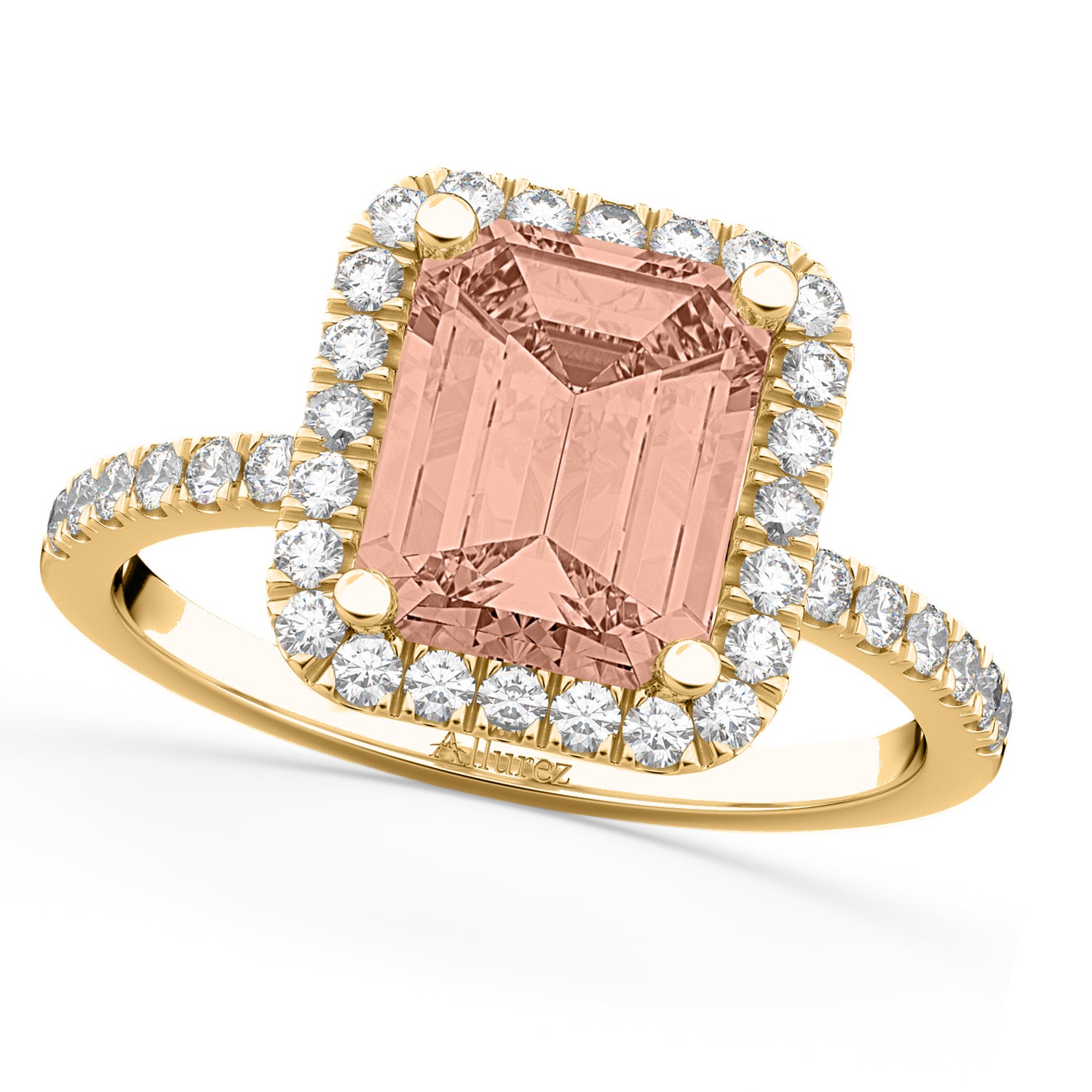 The prong set lab grown diamonds form a border around the Lab Morganite creating a rectangular halo, and also travel halfway down the ring's 18k yellow gold band.