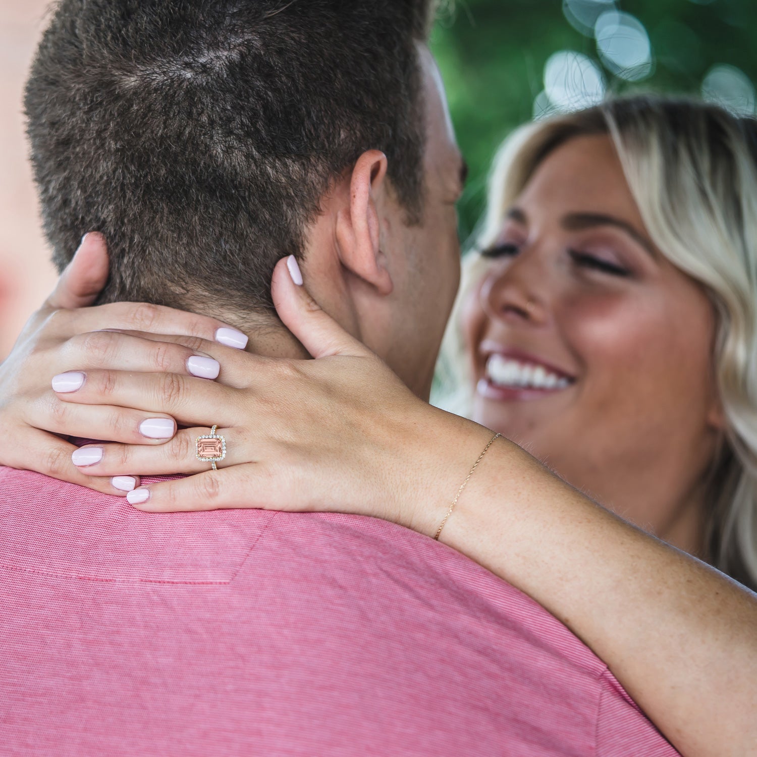 Expertly crafted in the USA, this Lab Morganite engagement ring can be worn as an anniversary ring or right hand fashion ring.