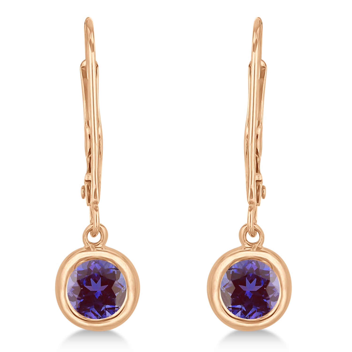 In this unique set of 14k rose gold (pink gold) leverback drop dangling earrings, each lab alexandrite is magnificently crafted in a bezel setting.