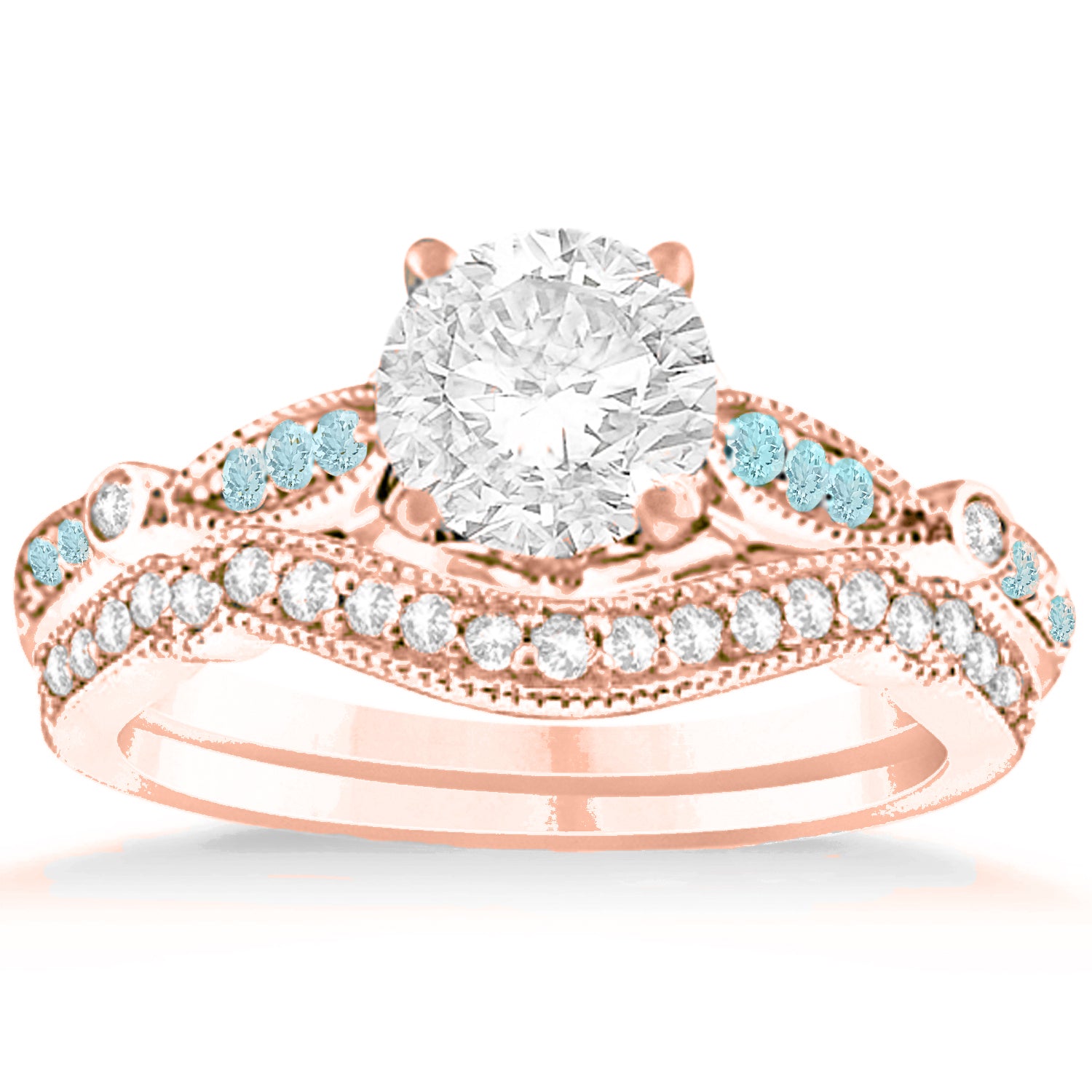 This vintage style bridal set setting includes 35, near colorless, round Aquamarine of about 0.29 total carat weight.