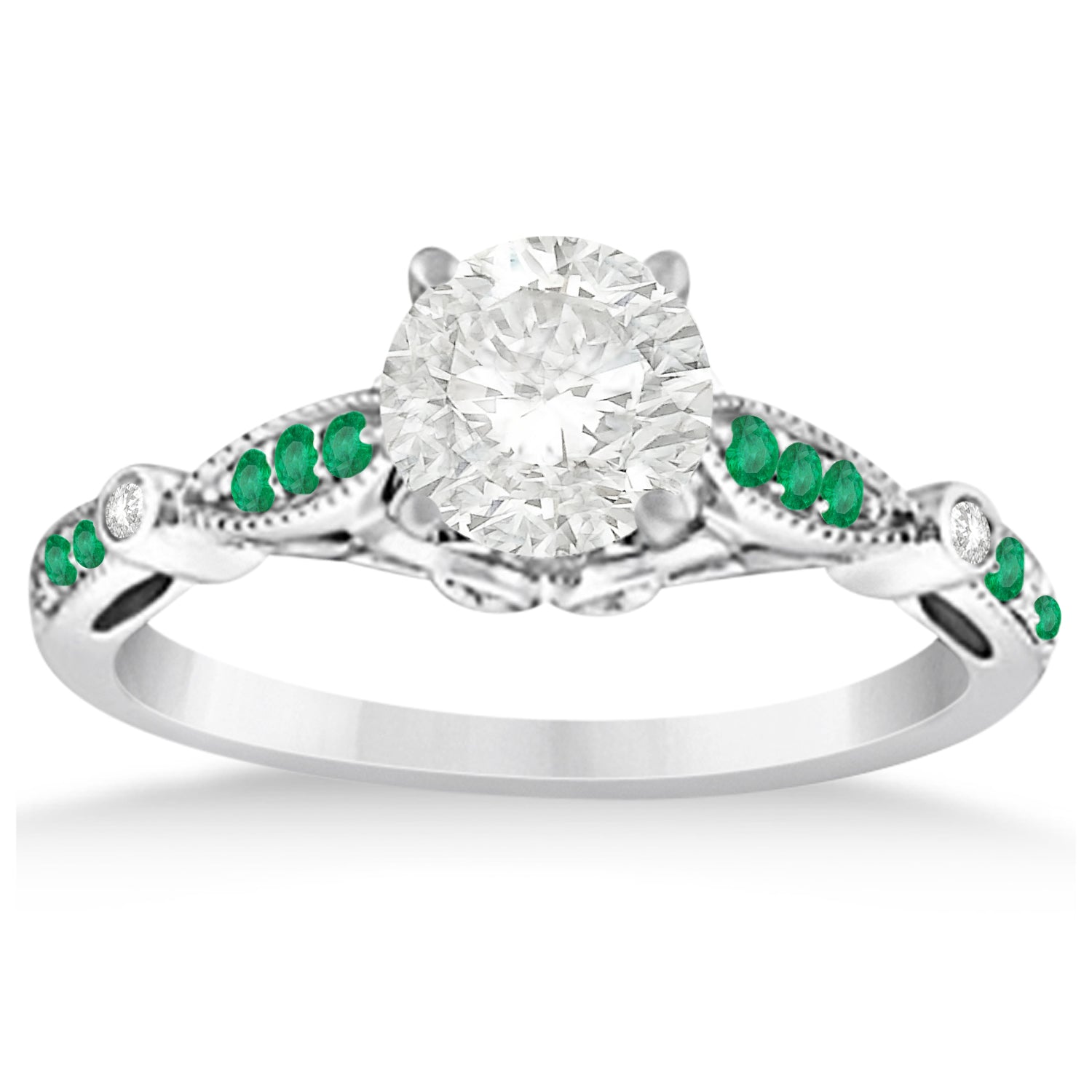 This antique style engagement ring setting features 14, near colorless, round Emerald of about 0.13 total carat weight. The Emerald side stones are prong set in a beautiful, milgrain edged marquise and dot design ring shank.
