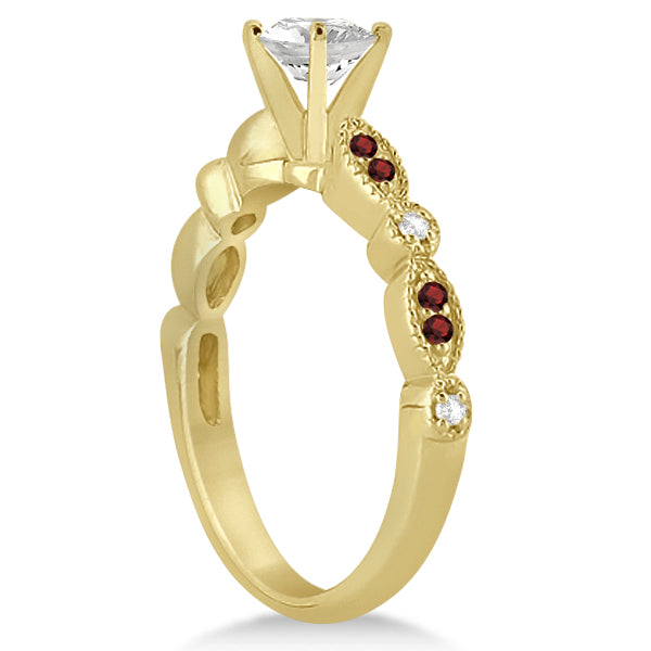 It features gorgeous red garnets weighing in at approximately 0.20ctw and 0.04cts of beautiful diamond side stone accents lining the band in a brilliant contemporary fashion. The round cut diamonds are of G-H color and VS2-SI1 clarity. The garnets are of eye clean clarity. This engagement ring has an approximate total carat weight of 0.24cts.