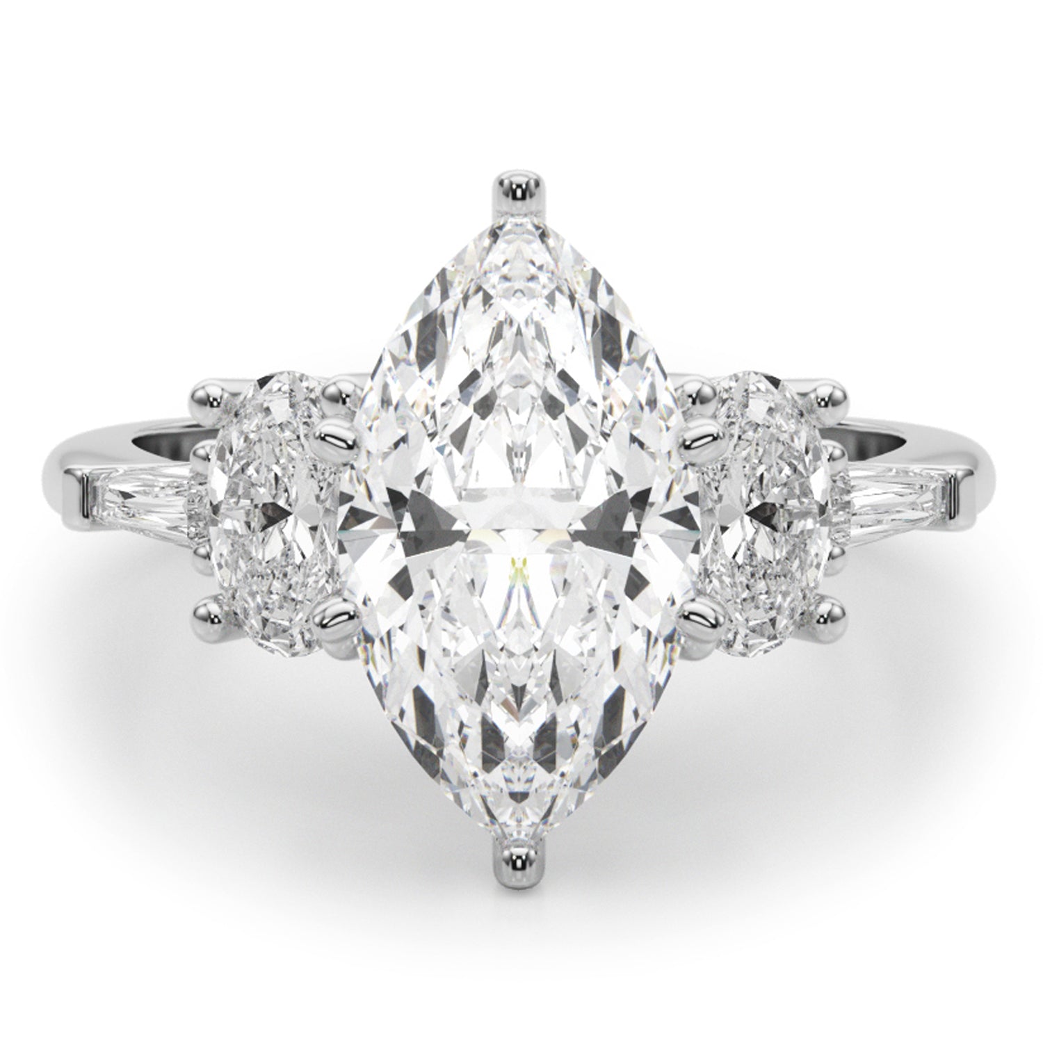 Discover the elegance of the Marquise Lab Grown Diamond Engagement Ring, meticulously crafted in 14K White Gold, showcasing a stunning 4.18-carat brilliance. The centerpiece is a breathtaking 3-carat Marquise diamond, surrounded by two oval 0.50-carat side stones (5.8x4.1mm) and two taper baguette 0.09-carat accent stones (4.02x1.5mm).