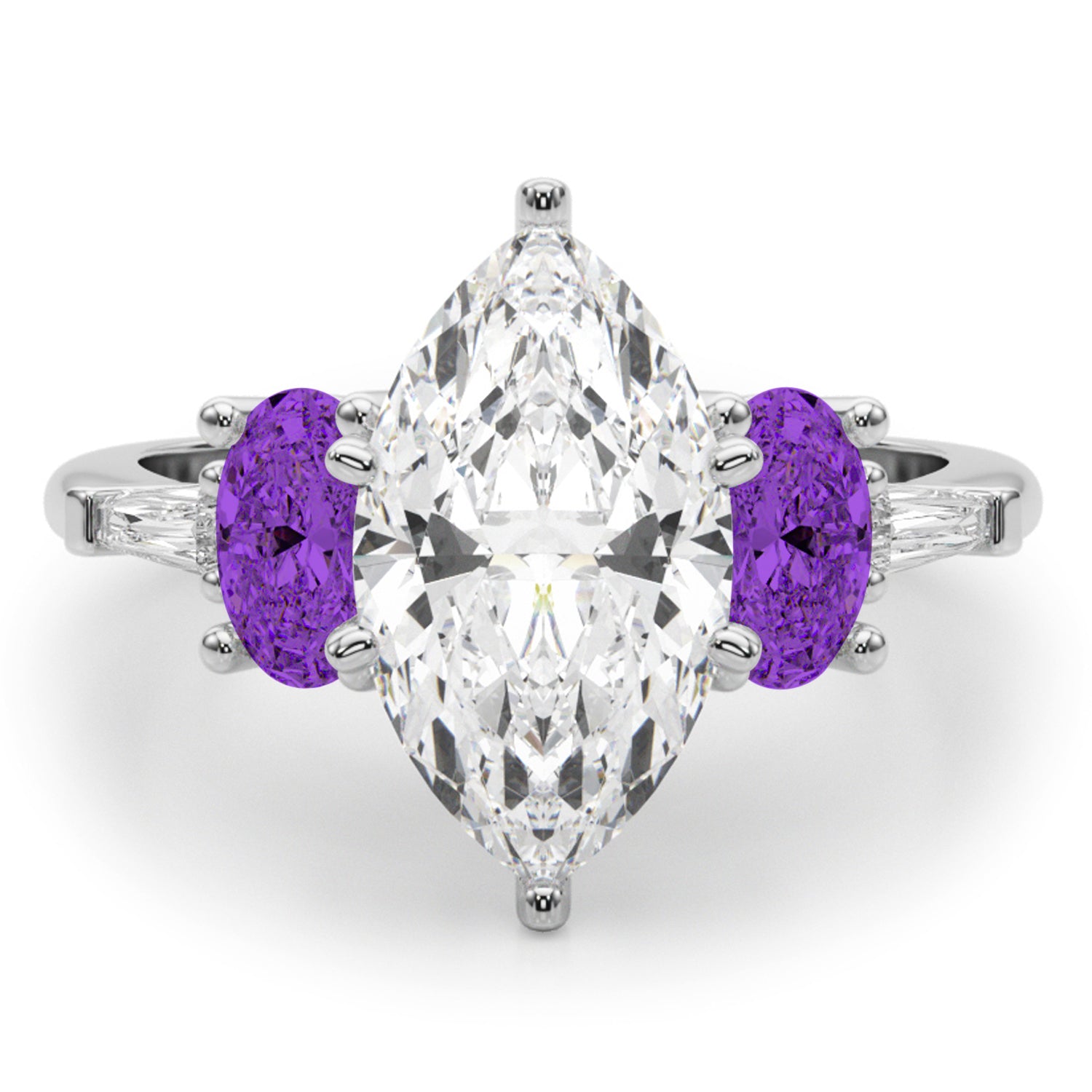 Discover the elegance of the Marquise Lab Diamond & Oval Amethyst Engagement Ring, meticulously crafted in Platinum, showcasing a stunning 3.98-carat brilliance. The centerpiece is a breathtaking 3-carat Marquise diamond, surrounded by two oval 0.40-carat amethyst side stones (5.8x4.1mm) and two taper baguette 0.09-carat accent stones (4.02x1.5mm).