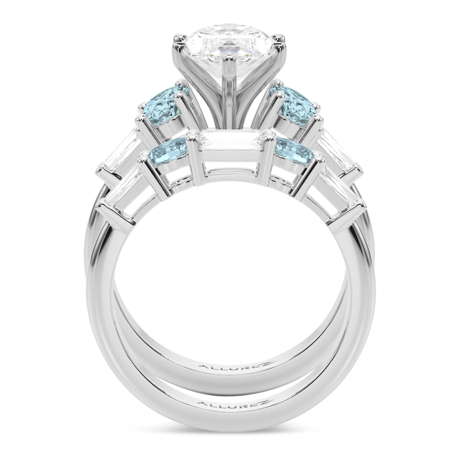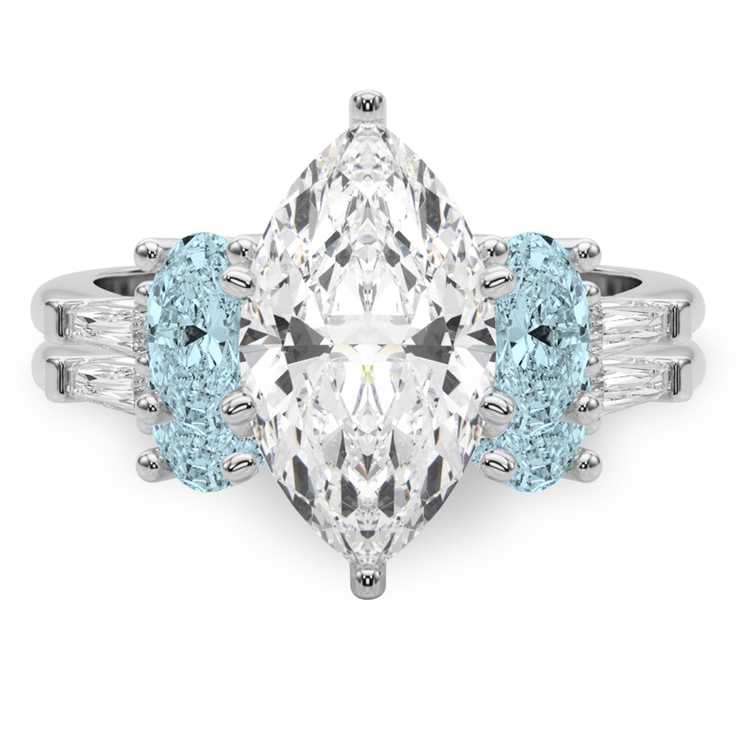 Discover the elegance of the Marquise Lab Grown Diamond & Oval Aquamarine Bridal Set, meticulously crafted in Platinum, showcasing a stunning 4.65-carat brilliance. The centerpiece is a breathtaking 3-carat Marquise Diamond, surrounded by two oval 0.40-carat Aquamarine side stones (5.8x4.1mm) and two taper baguette 0.09-carat accent stones (4.02x1.5mm). The exquisite wedding band showcases a stunning combination of lab grown diamonds, including a Straight Baguette (5x2.5), two delicate Taper Baguettes (4x2x1.5) and two radiant Oval Aquamarine stones (4x3).