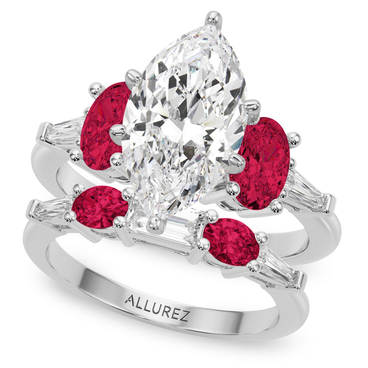 Marquise Lab Grown Diamond & Oval Ruby Bridal Set 14K White Gold (5.09ct)