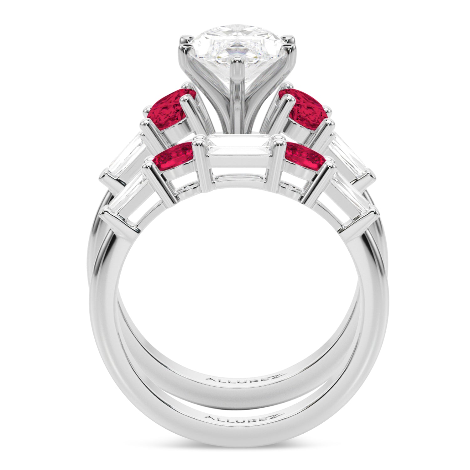 Discover the elegance of the Marquise Lab Grown Diamond & Oval Ruby Bridal Set, meticulously crafted in 14K White Gold, showcasing a stunning 5.09-carat brilliance. The centerpiece is a breathtaking 3-carat Marquise Diamond, surrounded by two oval 0.53-carat Ruby side stones (5.8x4.1mm) and two taper baguette 0.09-carat accent stones (4.02x1.5mm). The exquisite wedding band showcases a stunning combination of lab grown diamonds, including a Straight Baguette (5x2.5), two delicate Taper Baguettes (4x2x1.5) and two radiant Oval Ruby stones (4x3).