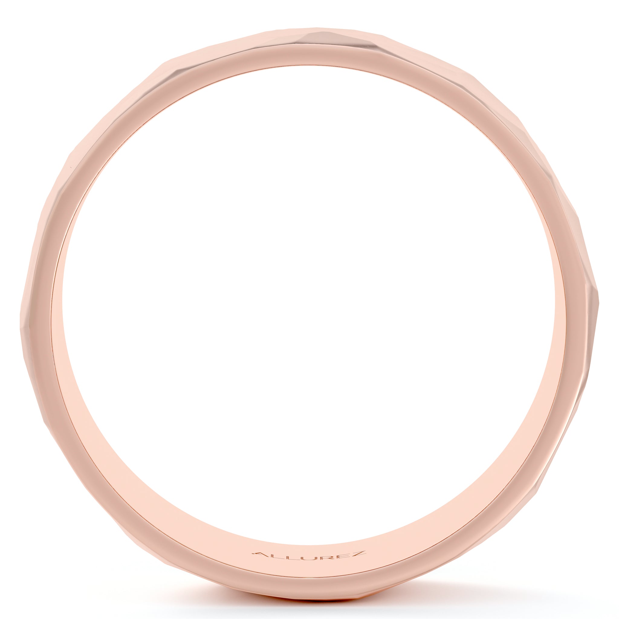 This contemporary men's designer ring is crafted in 18kt pink gold (rose gold) and features a shiny hammer finished band. For men that do not want to sacrifice style for comfort, this low dome styled band is comfort-fit with rounded inside edges to provide a perfect fit for him.