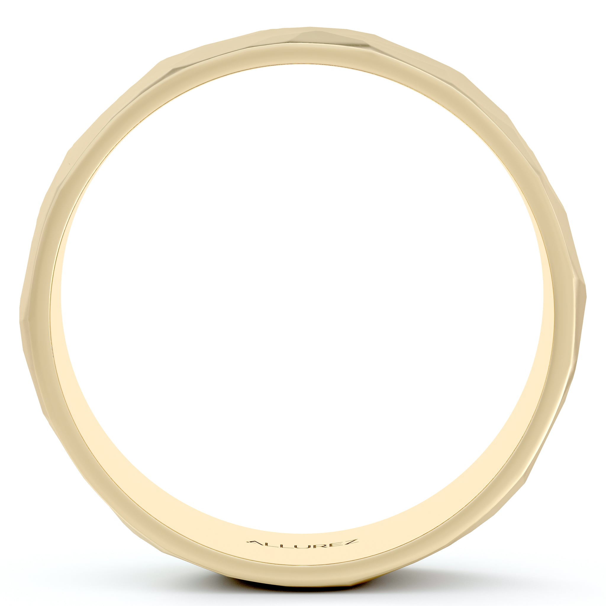 This contemporary men's designer ring is crafted in 18kt yellow gold and features a shiny hammer finished band. For men that do not want to sacrifice style for comfort, this low dome styled band is comfort-fit with rounded inside edges to provide a perfect fit for him.