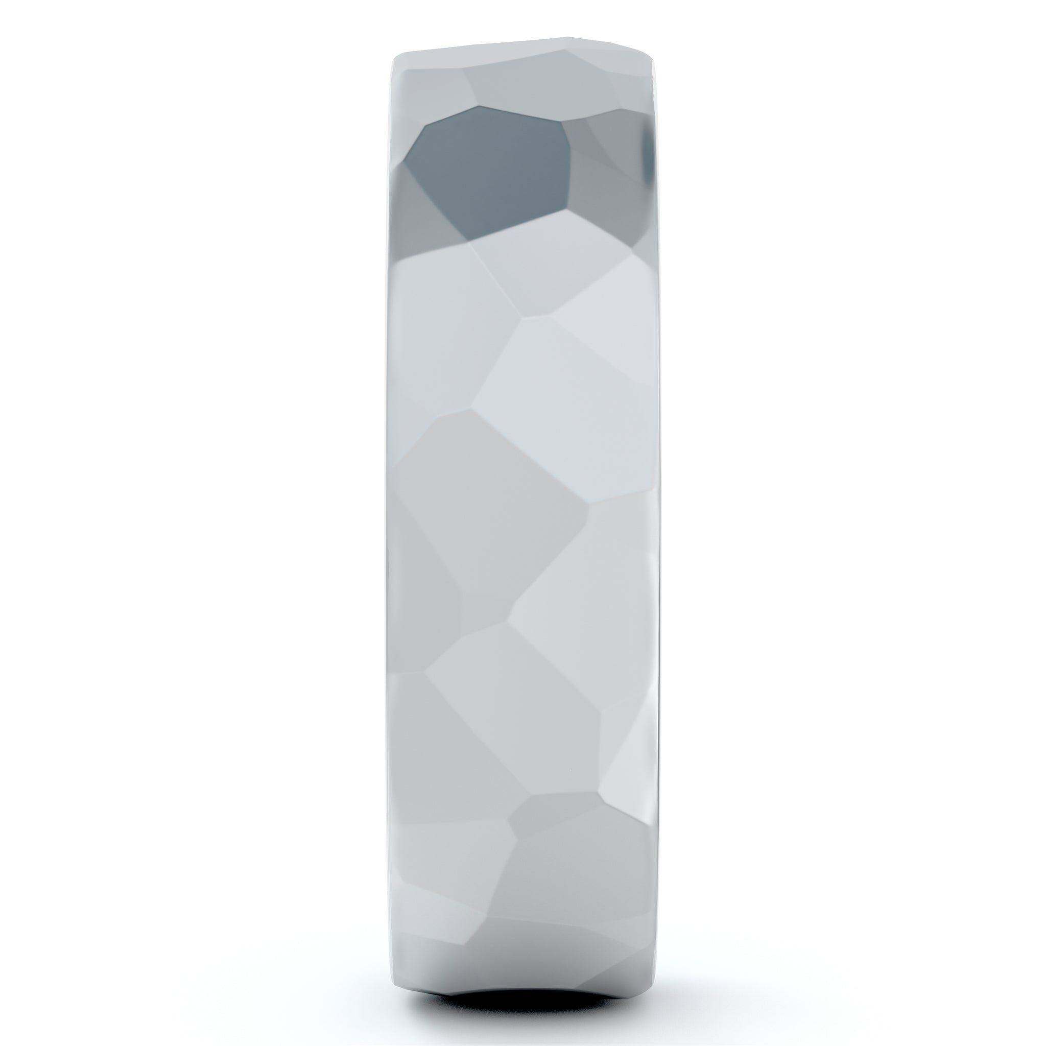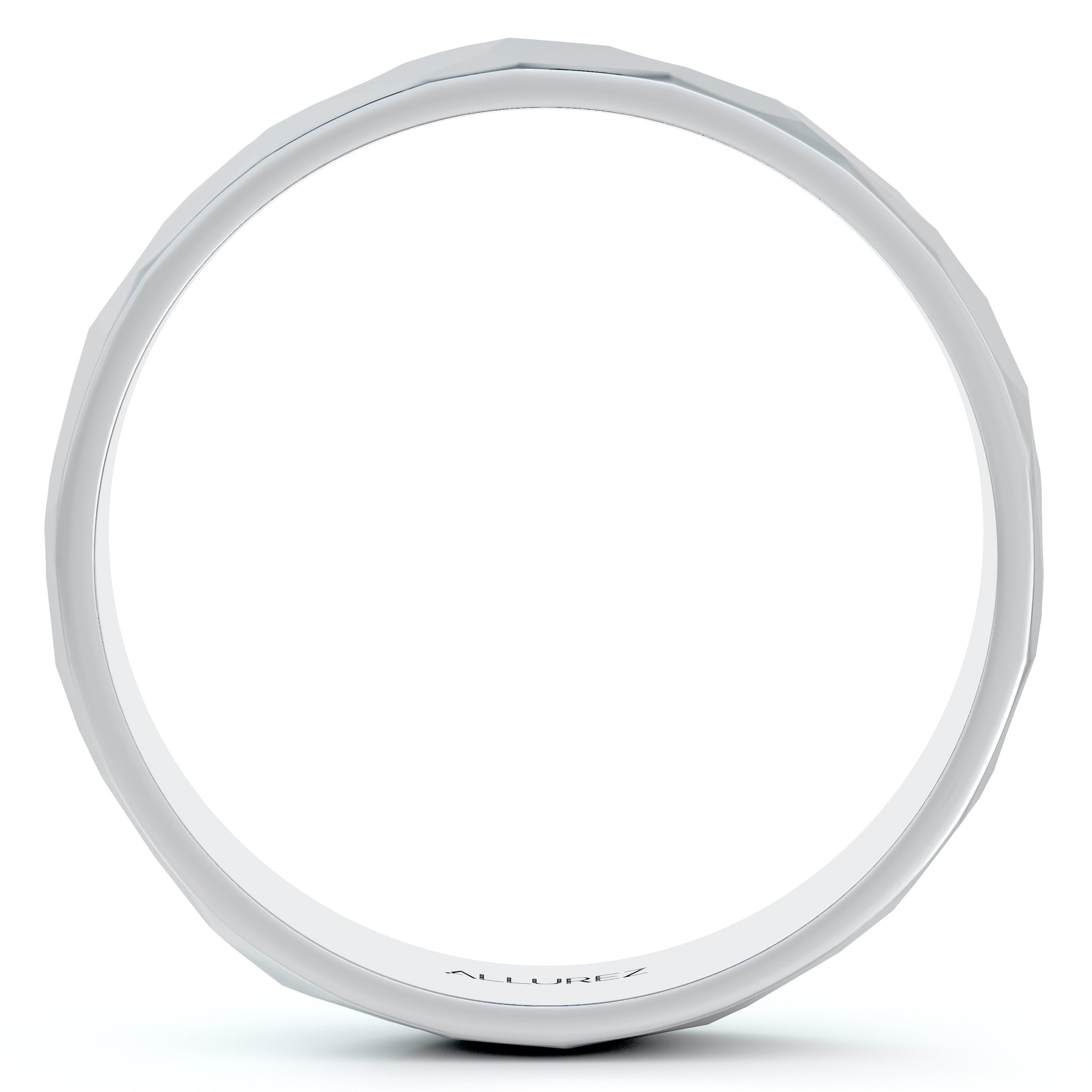 This contemporary men's designer ring is crafted in platinum and features a shiny hammer finished band. For men that do not want to sacrifice style for comfort, this low dome styled band is comfort-fit with rounded inside edges to provide a perfect fit for him.