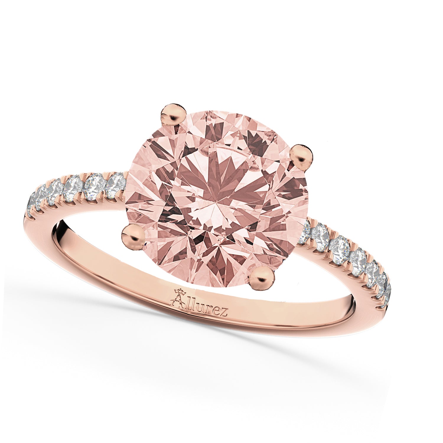 This eye-catching diamond sidestone accented ring features 0.21ct total weight of accent diamonds on the thin, 14k Rose Gold band, as well as accompanying a 1.75ct round cut Morganite.