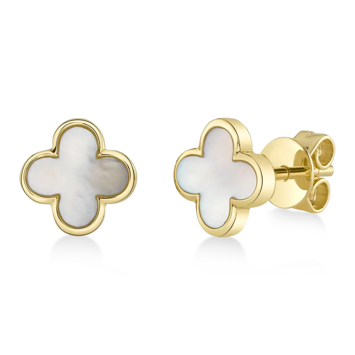 Illuminate your style with these Mother of Pearl Clover Stud Earrings in 14K Yellow Gold....
